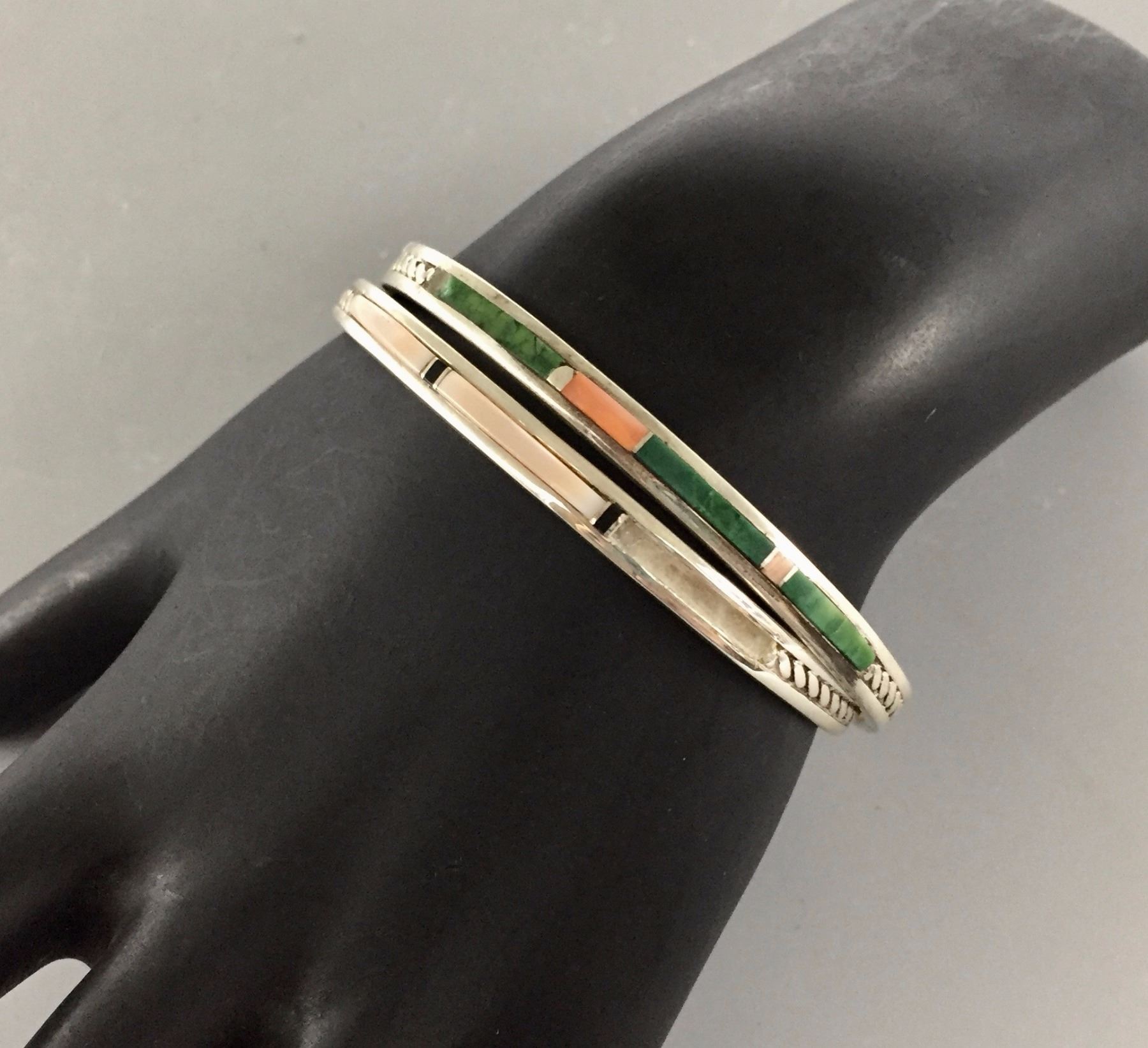 Maker: Unknown hallmark. Approx. Age: Fairly modern. Size: 1) Inside circumference 5 1/4” with an additional 1” opening (fits 6 1/4” wrist). approx. 1/4” at it’s widest. 2) Inside circumference 5 1/4” with an additional 1 1/4” opening (fits 6 1/2” wrist). approx. 1/4” at it’s widest. Lot weighs 22.1 g. Additional Info: Pair of sterling silver multi-stone inlay bracelets. Condition: Good for their age, normal wear expected. New, old stock (NOS). Please look closely at the pictures - they are an important part of our description. Shipping: There will be a $5 handling / packaging fee for shipping this lot. The actual cost of postage will be added on top of that.