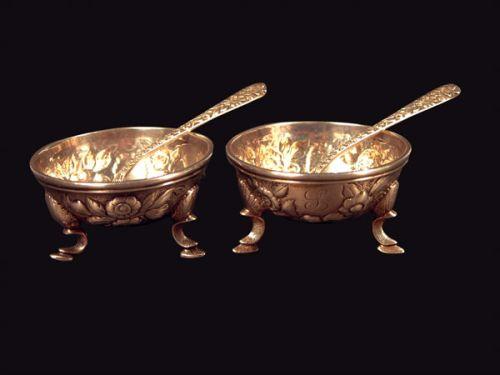 Pair of Sterling Silver Salt Dips, with matching spoons, floral design. Made by S. Kirk and Son, 11oz each. Monogram L, excellent condition.