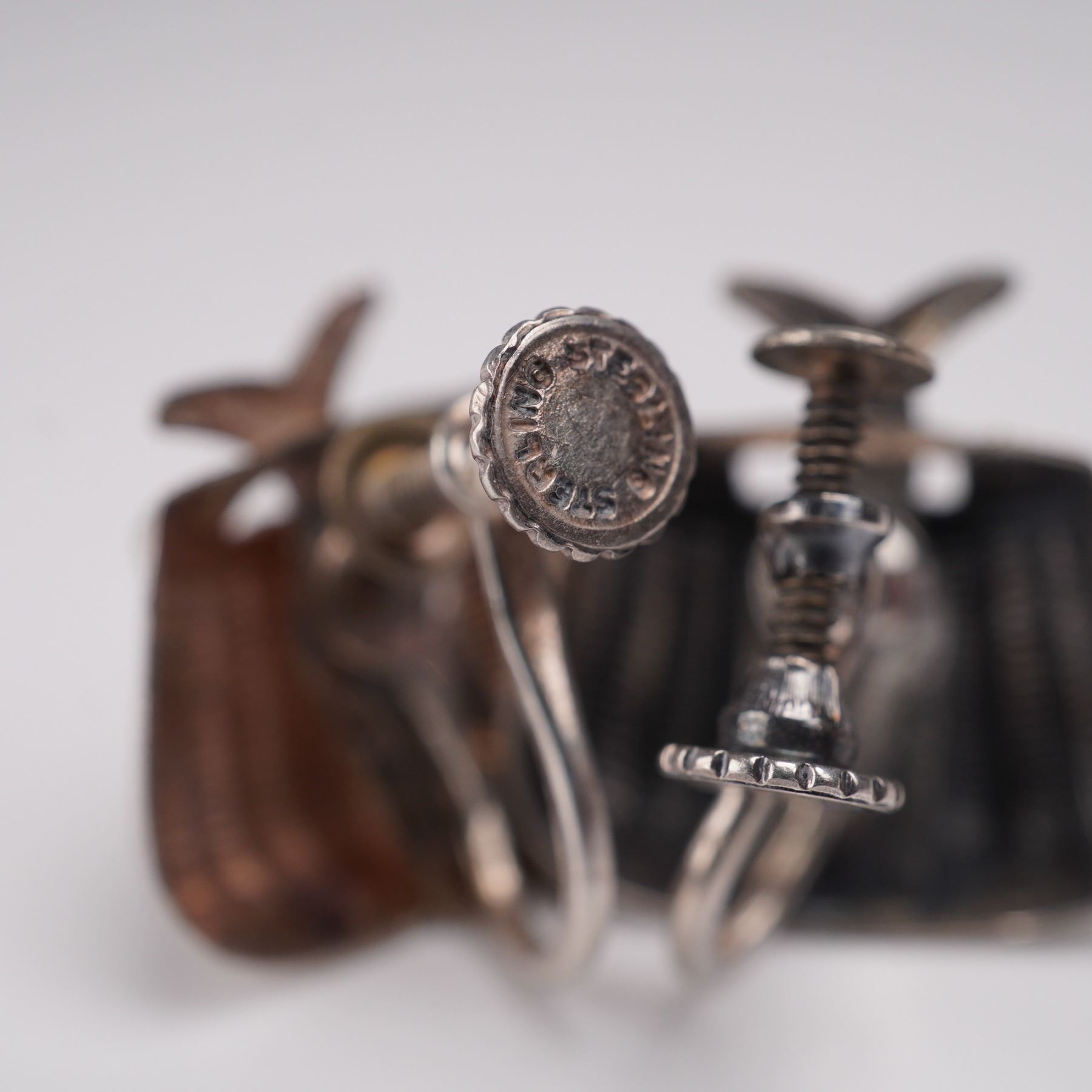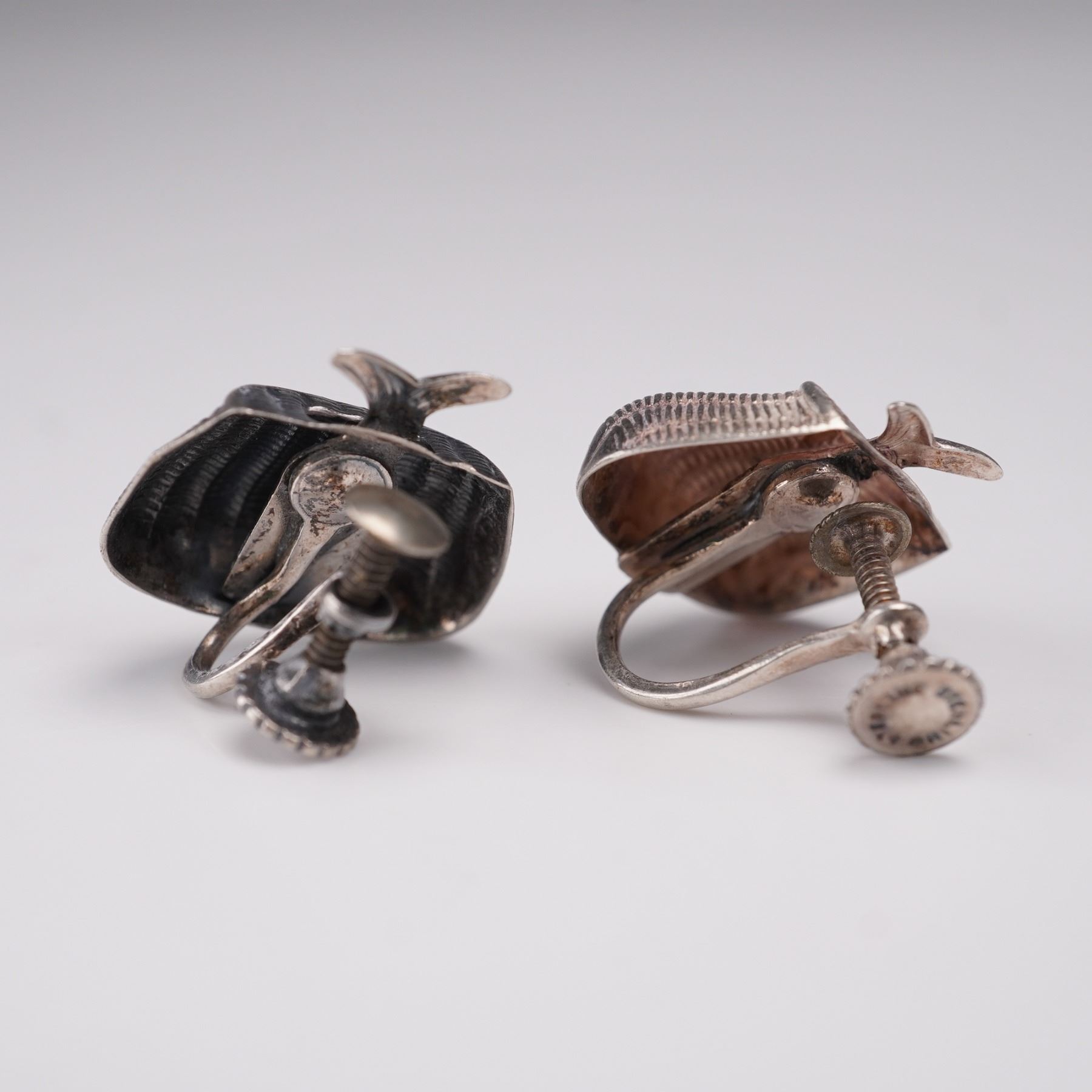 A pair of vintage sterling silver screwback earrings featuring a unique fish-in-basket design, with only the tail of the fish visible emerging from the woven-style basket. Marked sterling on the screwback findings. These earrings highlight intricate detail and a whimsical theme, making them a distinctive addition to any vintage jewelry collection. Weight: 3.64g.