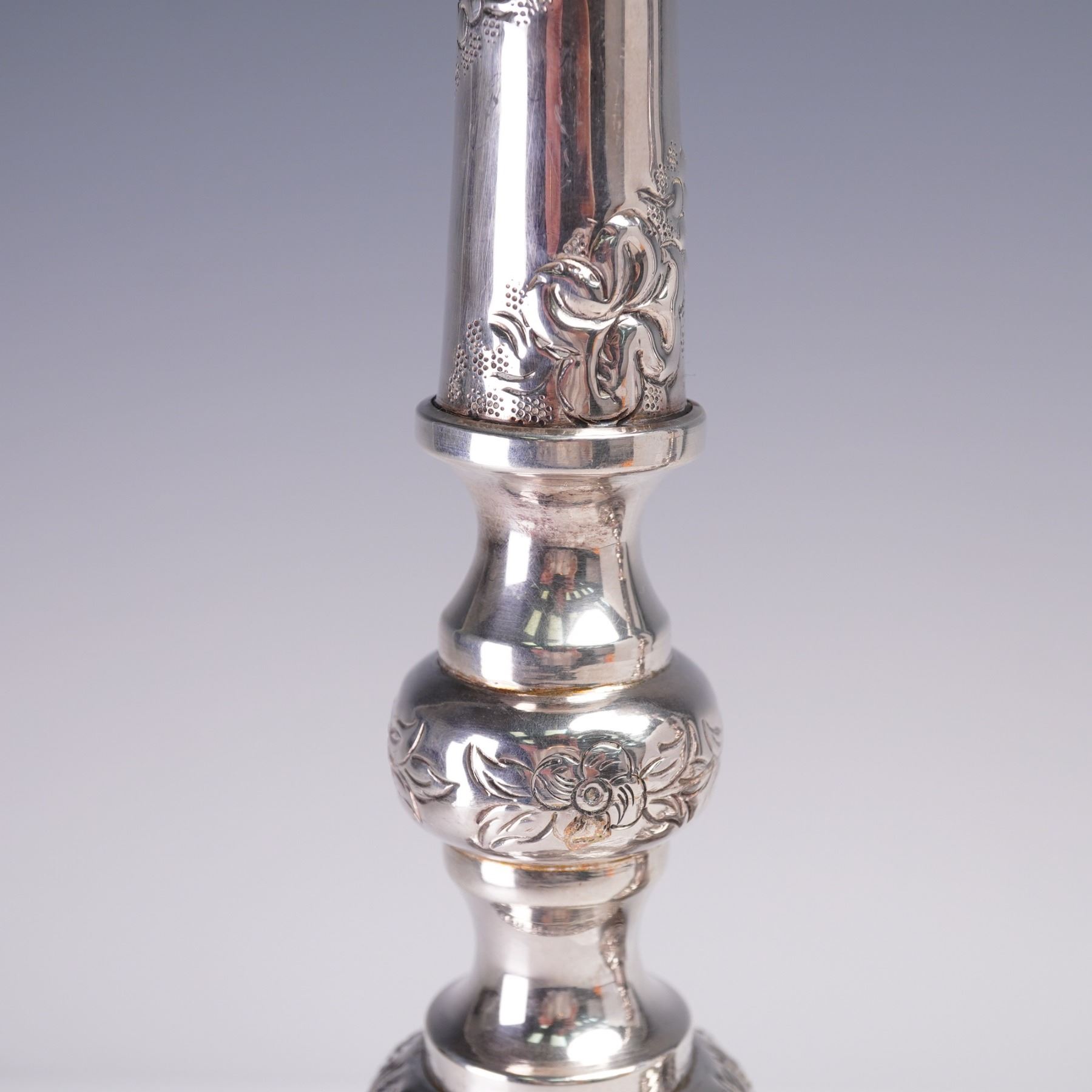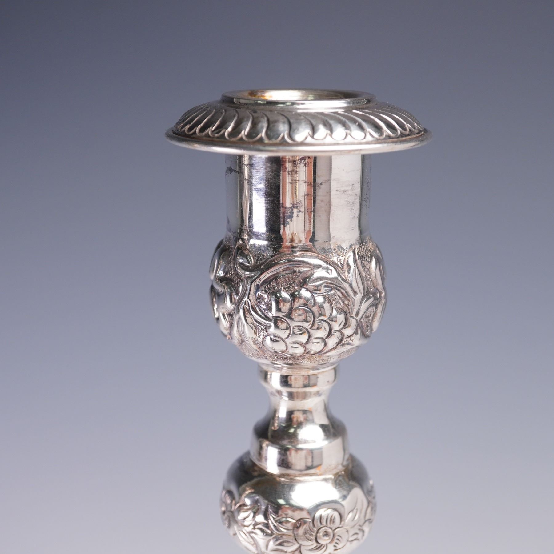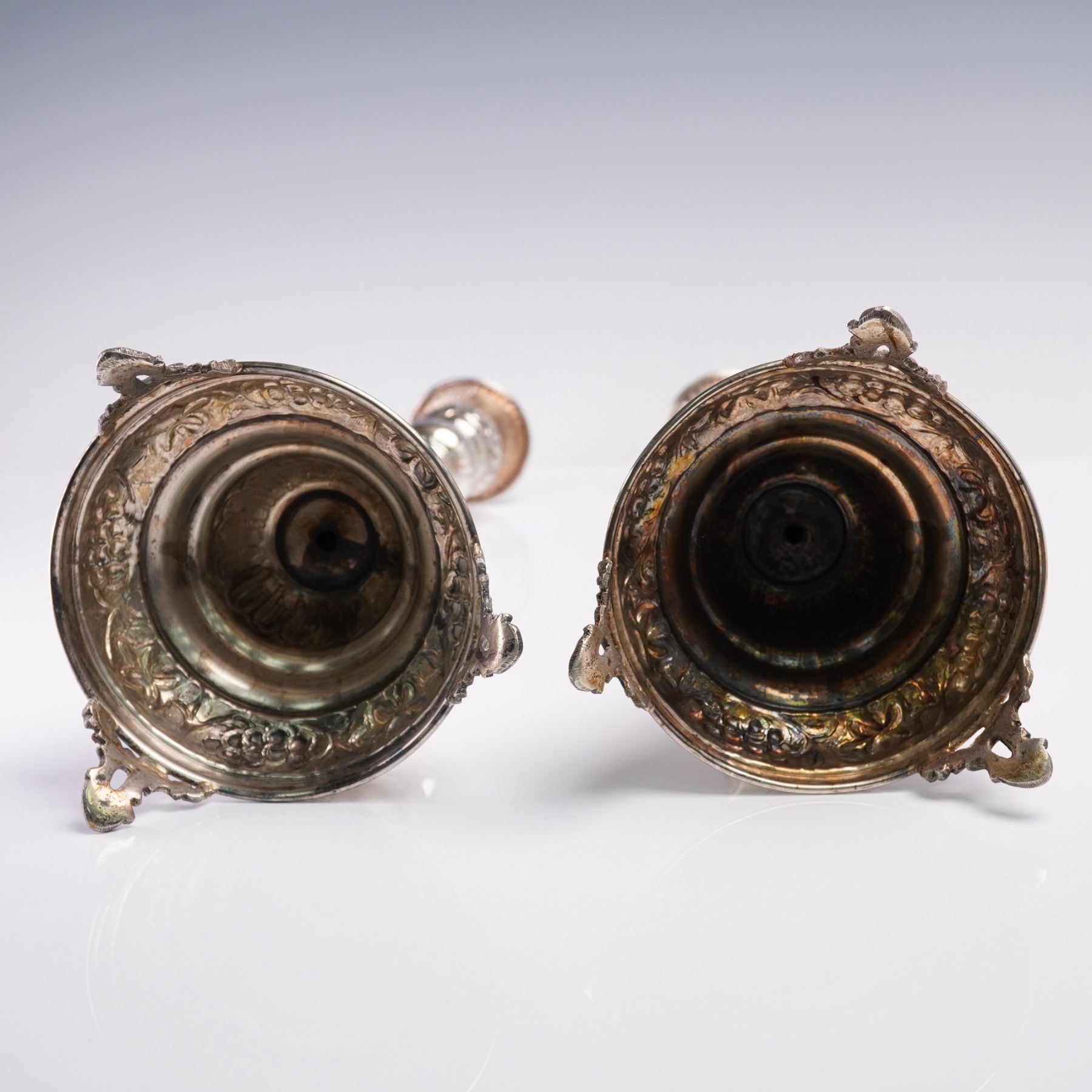 A pair of sterling silver table candlesticks, each featuring a tall baluster form and mounted on three scrolled feet. These candlesticks are adorned throughout with raised floral and foliate repousse decorations, including grapes, blossoms, and stylized scrollwork. The upper bobeches are decorated with leaf-tip borders, and the central knops and stems exhibit floral garlands and cross motifs in relief. The bases are domed and heavily ornamented with scrolling grapevine and floral repousse work, set above ornate tri-footed mounts with openwork detailing. The bases show some oxidation and wear consistent with age. The candlesticks are fully hallmarked on the undersides 925 for sterling silver, though the specific marks are partially worn and illegible in areas. Candlestick 1: 9.39 troy oz net silver. Candlestick 2: 9.30 troy oz net silver.