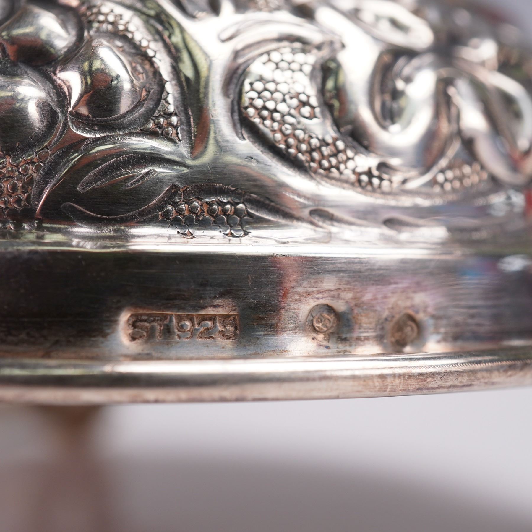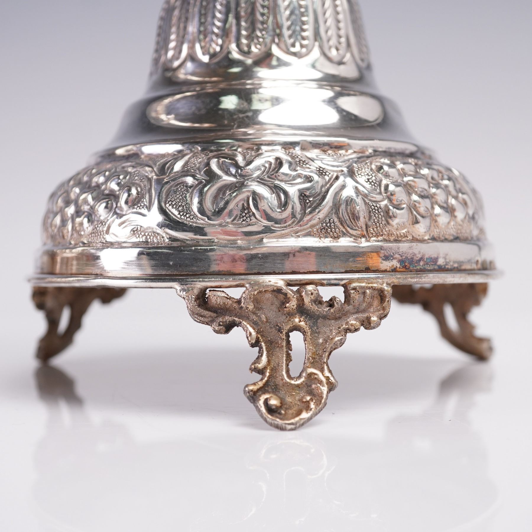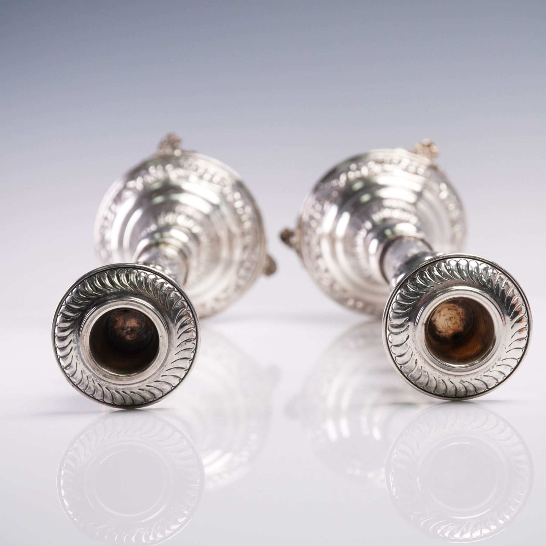 A pair of sterling silver table candlesticks, each featuring a tall baluster form and mounted on three scrolled feet. These candlesticks are adorned throughout with raised floral and foliate repousse decorations, including grapes, blossoms, and stylized scrollwork. The upper bobeches are decorated with leaf-tip borders, and the central knops and stems exhibit floral garlands and cross motifs in relief. The bases are domed and heavily ornamented with scrolling grapevine and floral repousse work, set above ornate tri-footed mounts with openwork detailing. The bases show some oxidation and wear consistent with age. The candlesticks are fully hallmarked on the undersides 925 for sterling silver, though the specific marks are partially worn and illegible in areas. Candlestick 1: 9.39 troy oz net silver. Candlestick 2: 9.30 troy oz net silver.
