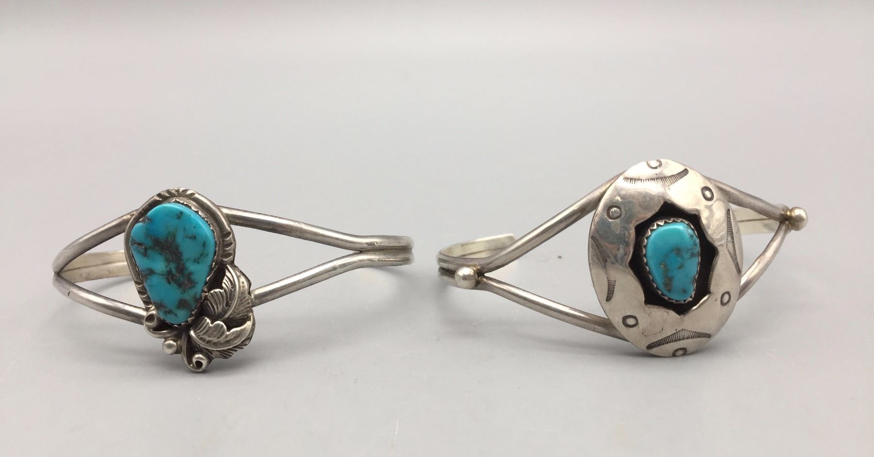 Description: Two sterling silver and turquoise bracelets. Maker: Various. One is hallmarked, CL. Approx. Age: Vintage. Size: 1) Inside circumference measures approx. 5 3/8“ with a 1” gap (making this bracelet fit about a 6 3/8” wrist). It is 1 1/8” wide across the face. 2) Inside circumference measures approx. 5“ with a 1 1/8” gap (making this bracelet fit about a 6 1/8” wrist). It is 1” wide across the face. Combined weight of 25.6 g. Condition: Good for their age, normal wear expected. Please look closely at the pictures - they are an important part of our description. Shipping: There will be a $5 handling / packaging fee for shipping this lot. The actual cost of postage will be added on top of that.