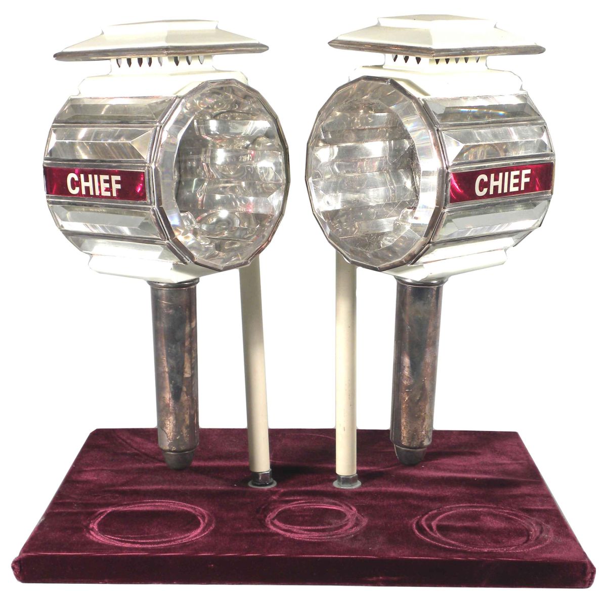 Pair of Fire Chief Buggy Side Lamps by A. P. Devousney Maker, NY. Patented Oct 30, 1860. Four rectangular leaded glass panels on each side including ruby panel etched "Chief". No chips or cracks, all original. Each measures 14 inches.