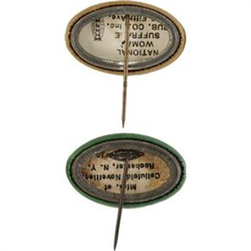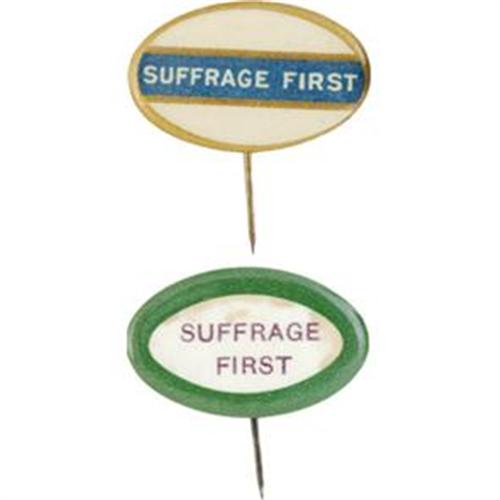 <B>Pair of "Suffrage First" Oval Pinbacks,</B></I> each 16mm x 27mm. The "Suffrage First" slogan came from Alice Paul's National Woman's Party, organized in 1916. Paul and her organization believed that the first priority of Congress in 1917 was the issue of voting rights for women and that all other issues should accordingly be put aside until it was attained. The blue, white, and gold pin is somewhat of an enigma. Its backpaper reveals that it was made by the National Woman Suffrage Publishing Company. The publishing company was created in 1914 by the National Woman Suffrage Association. The militant NWP was often at odds with its more conservative counterpart, NAWSA, and it appears unusual that they would use its rival's publishing house to manufacture one of their pins. At any rate, this oval badge is in very fine condition and one of the more attractive suffrage lapel items. Its oval companion pin in green, black, and white was made by Bastian Brothers of Rochester, New York. Also containing the slogan developed by Alice Paul's National Woman's Party, this pin is not in their traditional colors of purple (sometimes blue), white, and gold. This pin is scarcer than its companion. Slight staining in the field, else very fine condition.<BR><BR><b>Shipping:</b> Small Collectibles (<a target="_blank" href="http://www.heritageauctions.com/common/shipping.php">view shipping information</a>)