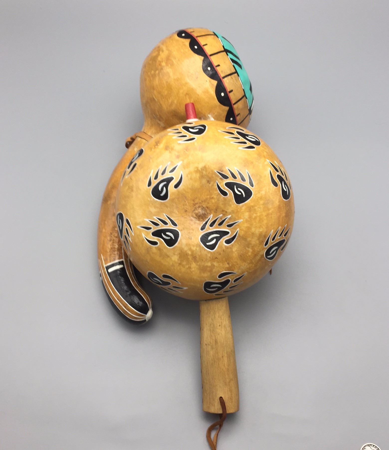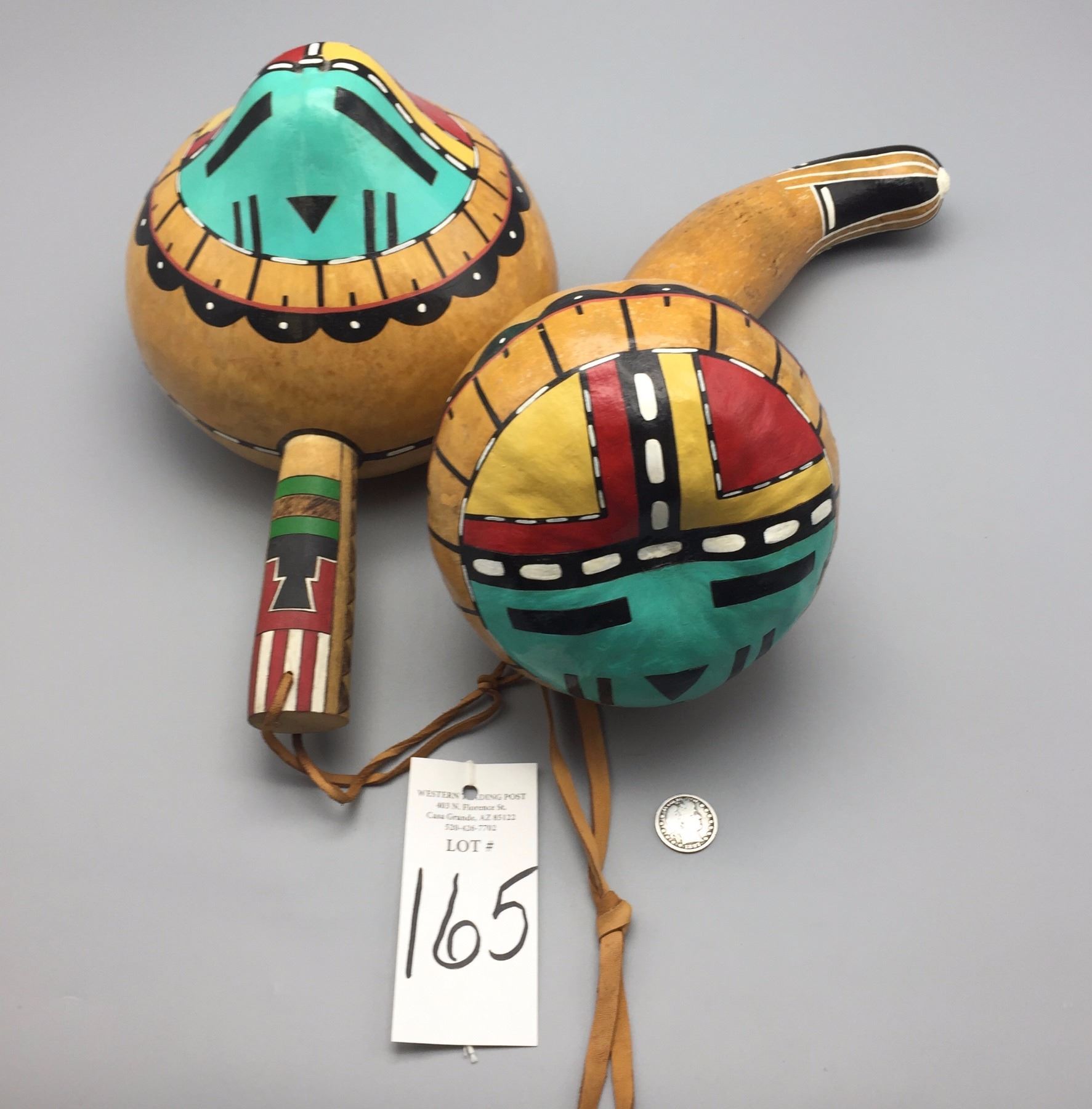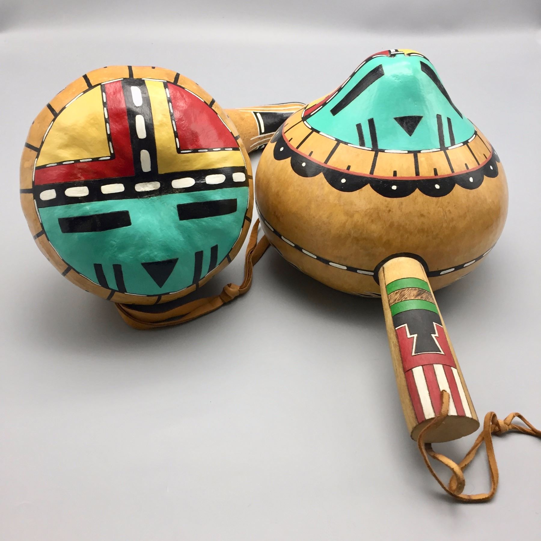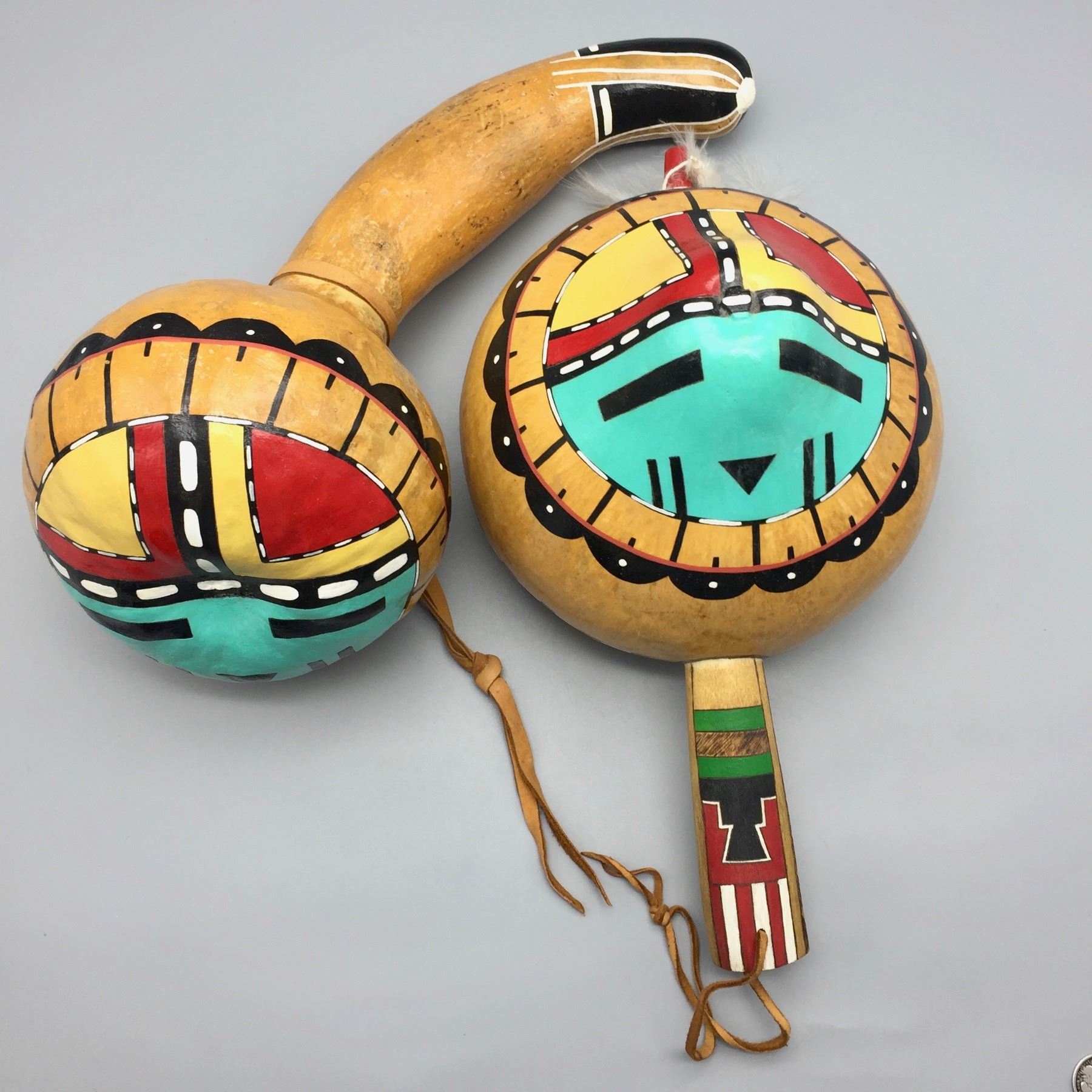 Maker: Unknown (apparently Hopi) maker. Approx. Age: Fairly modern. Size: Measure 13 1/2” to 15” h and almost 8” wide. Additional Info: Pair of hand painted Hopi Sunface gourd rattles. Condition: Good for heir age, normal wear expected. Please look closely at the pictures - they are an important part of our description. Shipping: There will be a $7 handling / packaging fee for shipping this lot. The actual cost of postage will be added on top of that.
