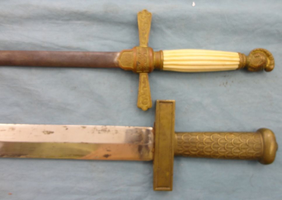 Long sword w/approx 27" unmarked blade. Brass guard & carved bone handle. In good condition. Short sword w/scabbard appears to be a movie prop style. Heavy construction w/brass handle & decorative scabbard & chain.