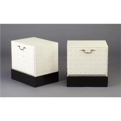 Pair of TOMMI PARZINGER ivory enameled nightstands with prunted case with drop-front, brass hardware and interior drawer on black enameled base. Branded Parzinger Originals. 20" x 20" x 16" $1,500 - 2,000