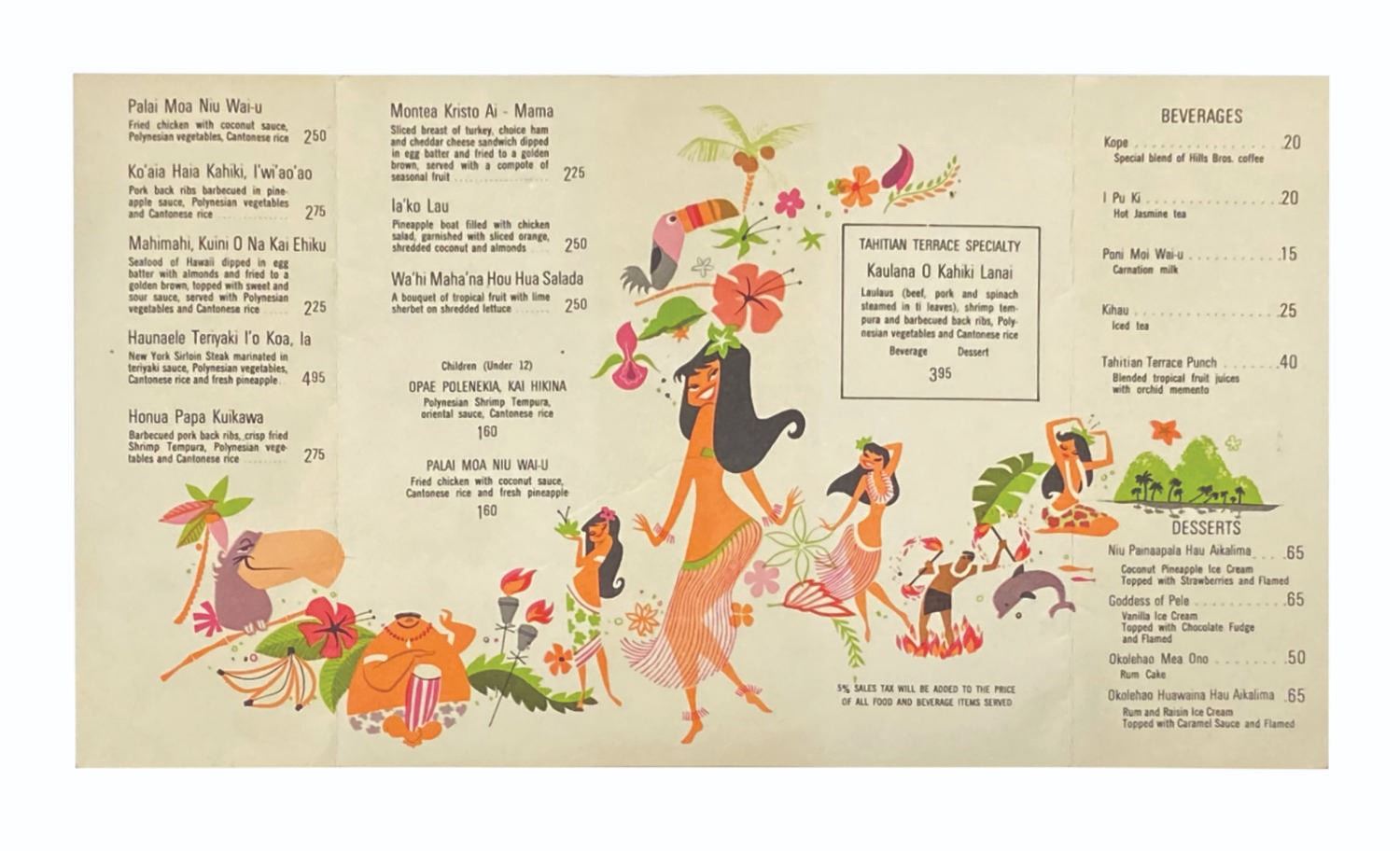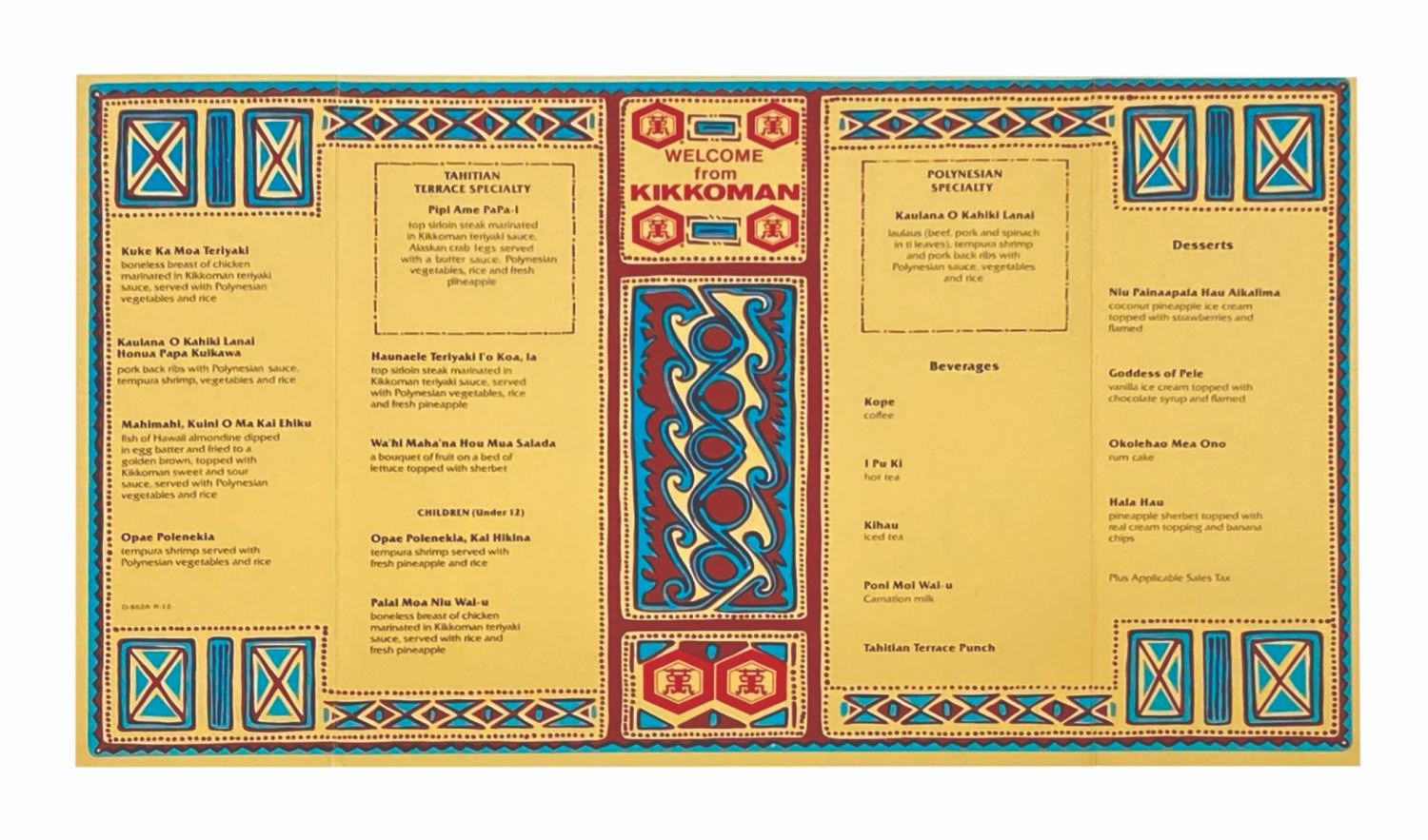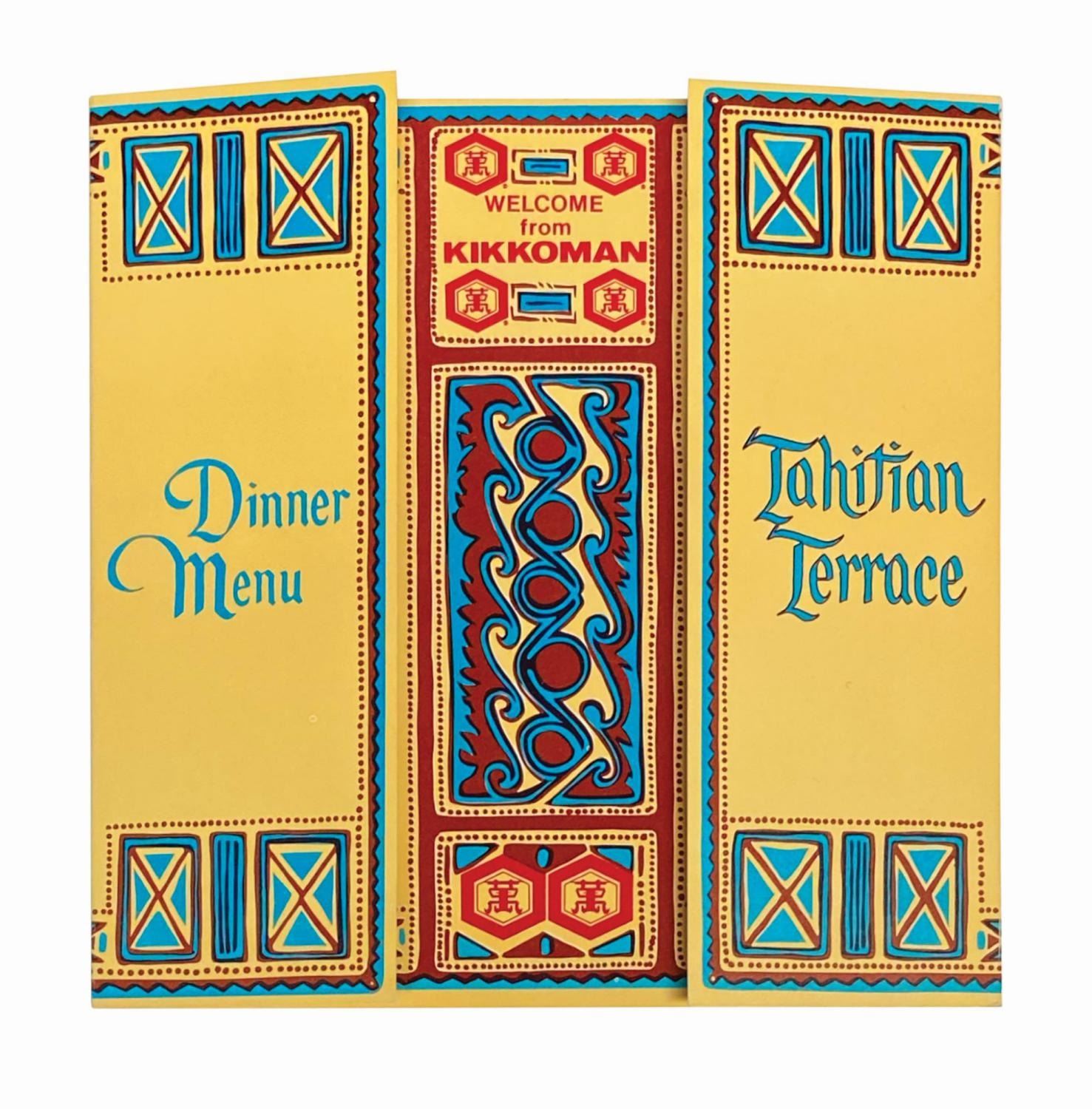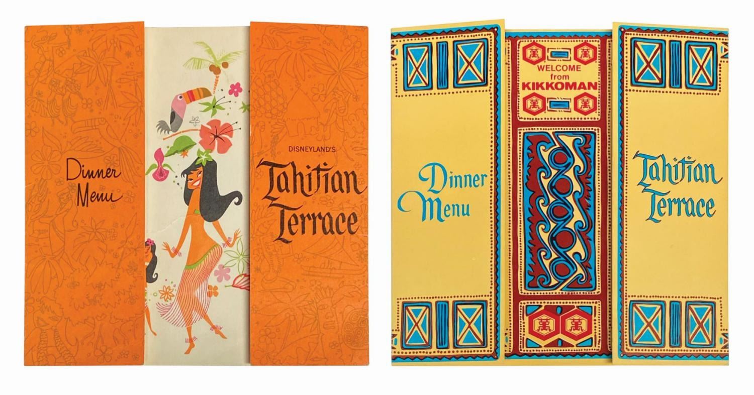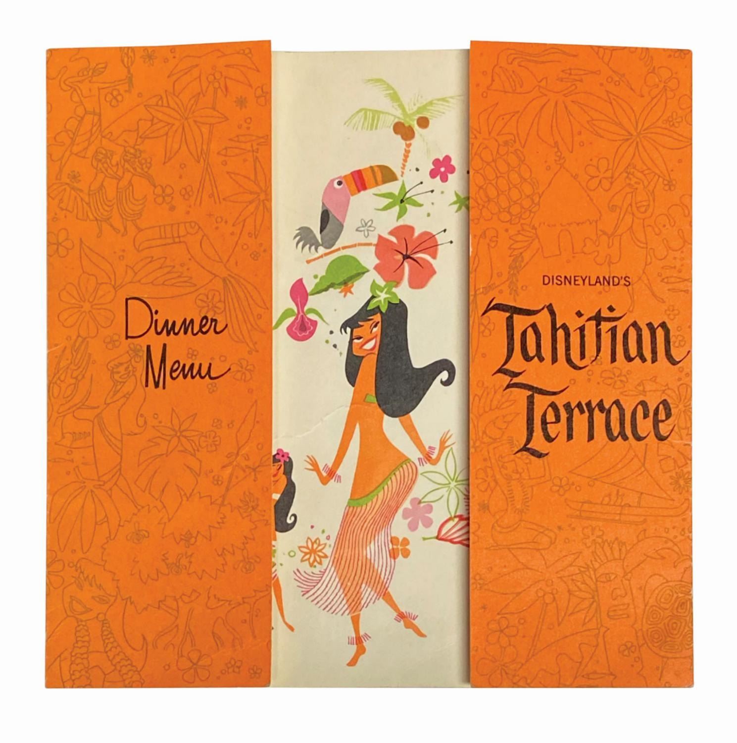 (Disneyland, 1970s-80s) A pair of gatefold Tahitian Terrance dinner menus from the famous Adventureland restaurant. The set includes a 1970s era menu with Mod stylized Polynesian dancer and tropical bird illustrations and a 1980s menu from the period of Kikkoman's sponsorship of the attraction, which is decorated with patterns inspired by the work of indigenous South Seas artisans. Both menus list entree, dessert, and beverage options, and feature the story of the Terrace on the reverse. Measuring 5"x5", the menus are in very good condition. The 70s example exhibits light handling creases throughout.