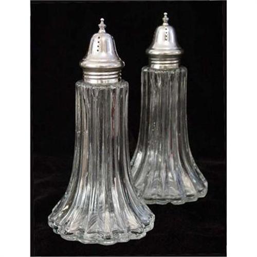 <table width="100%" border="0" cellspacing="0" cellpadding="4"><tr><td><em> Rare Pair!</em></td></tr><tr> <td width="100%"> Beautiful pair of tall confectioner's sugar casters made out of glass and silver-plated lids. Glass is in very good condition, with no chips, cracks nor repairs; one of the metal lids has a tear but still screws on tightly (see photo). Please ask questions, request additional photos and shipping costs before buying.