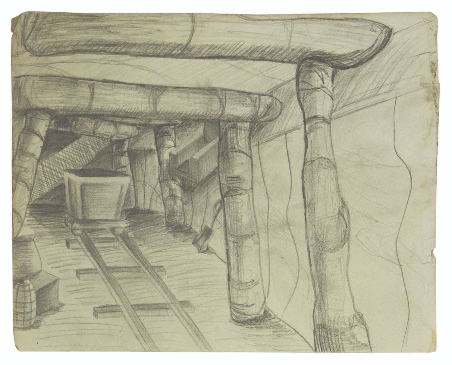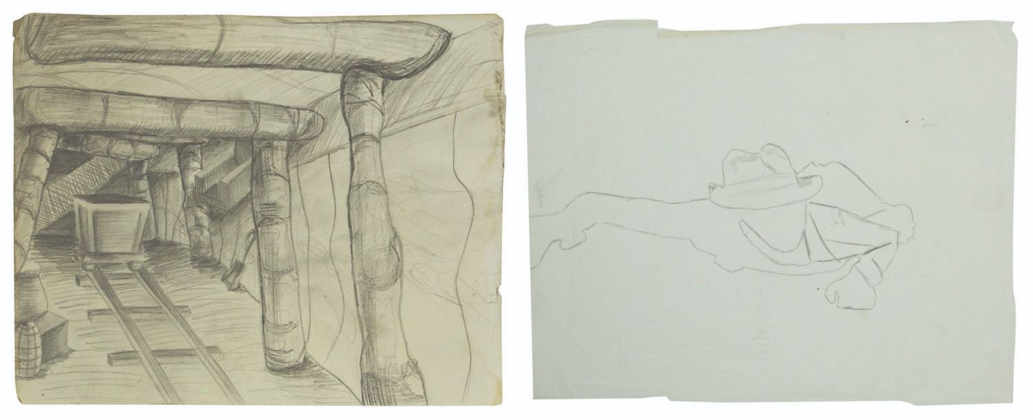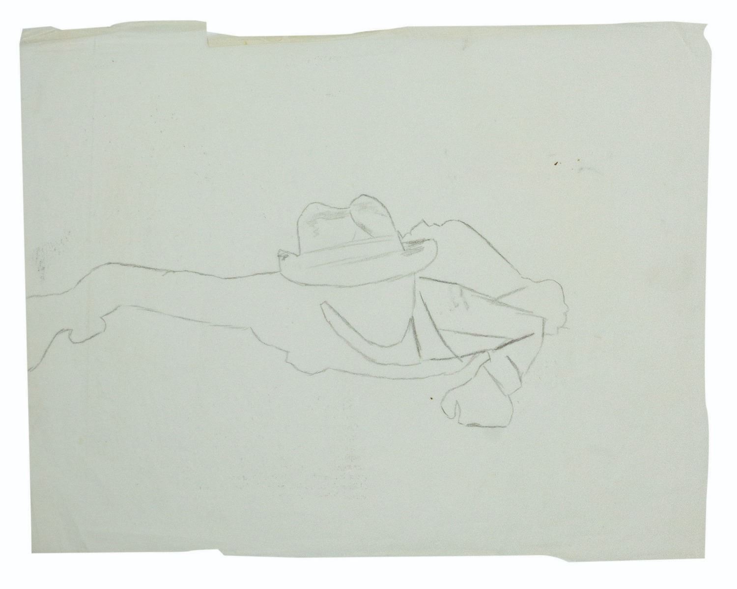 (Paramount, 1984) A pair of original production drawings for thrilling special effects sequences in Indiana Jones and the Temple of Doom, from the collection of a former studio employee. The pieces include a drawing for the mine car chase sequence accomplished in pencil on art paper depicting a car barreling along a track in a mine shaft and a drawing for the rope bridge sequence accomplished in pencil on vellum depicting Indy in outline, hanging on for dear life. Measuring 8"x10.75" and 8.75"x11.75" respectively, the drawings are in good condition with staple holes, adhesive residue to the reverse from mounting, edge tears and rolling, minor edge soiling, and general wear from production use.