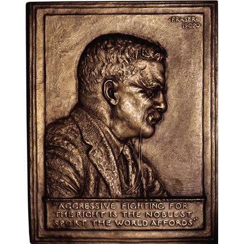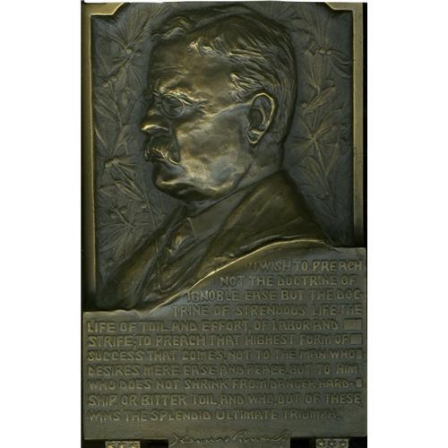<B>Pair of Theodore Roosevelt Plaques.</B></I> A very interesting pair of plaques that should be worthy of consideration by a wide range of bidders. Roosevelt is primarily known to numismatists because of his personal involvement in the manufacture of the ten and twenty dollar gold pieces of 1907, but these plaques demonstrate his enduring popularity as a national leader.<BR> The first piece is a scarce small variety galvano from 1920. Designed by James Earl Fraser. 9 11/16 x 7 1/2 inches (24.6 x 19.8 cm). Copper silverplate backed with lead. Portrait facing right with a three-line inscription: AGGRESSIVE FIGHTING FOR THE RIGHT IS THE NOBLEST SPORT THE WORLD AFFORDS. This quote is attributed to Roosevelt during his tenure as New York Police Commissioner (1895-1897). This small-sized piece is several times scarcer than the large format foundry cast issued by Decorative Arts League, NYC. Made by the electrogalvanic process by Medallic Art Company (but unsigned). The silverplate is slightly yellowed. The back has two screws and a wire hanger.<BR> The second piece in this impressive lot is a large plaque that is attributed to G.M. Sander (?), circa 1900. 13 x 7 1/2 inches (33 x 19.2 cm). Cast bronze. The portrait faces left with an 11-line quote below. While not a particularly well-known quote, it summarizes Roosevelt's beliefs: I WISH TO PREACH NOT TO THE DOCTRINE OF IGNOBLE EASE BUT THE DOCTRINE OF STRENUOUS LIFE, THE LIFE OF TOIL AND EFFORT, OF LABOR AND STRIFE; TO PREACH THAT HIGHEST FORM OF SUCCESS THAT COMES, NOT TO THE MAN WHO DESIRES MERE EASE AND PEACE, BUT TO HIM WHO DOES NOT SHRINK FROM DANGER, HARDSHIP, OR BITTER TOIL, AND WHO, OUT OF THESE, WINS THE SPLENDID ULTIMATE TRIUMPH. Signed below. Two supporting brackets are on the bottom with stars and stripes motif. Hanger and ring on the back. Dark brown patina.