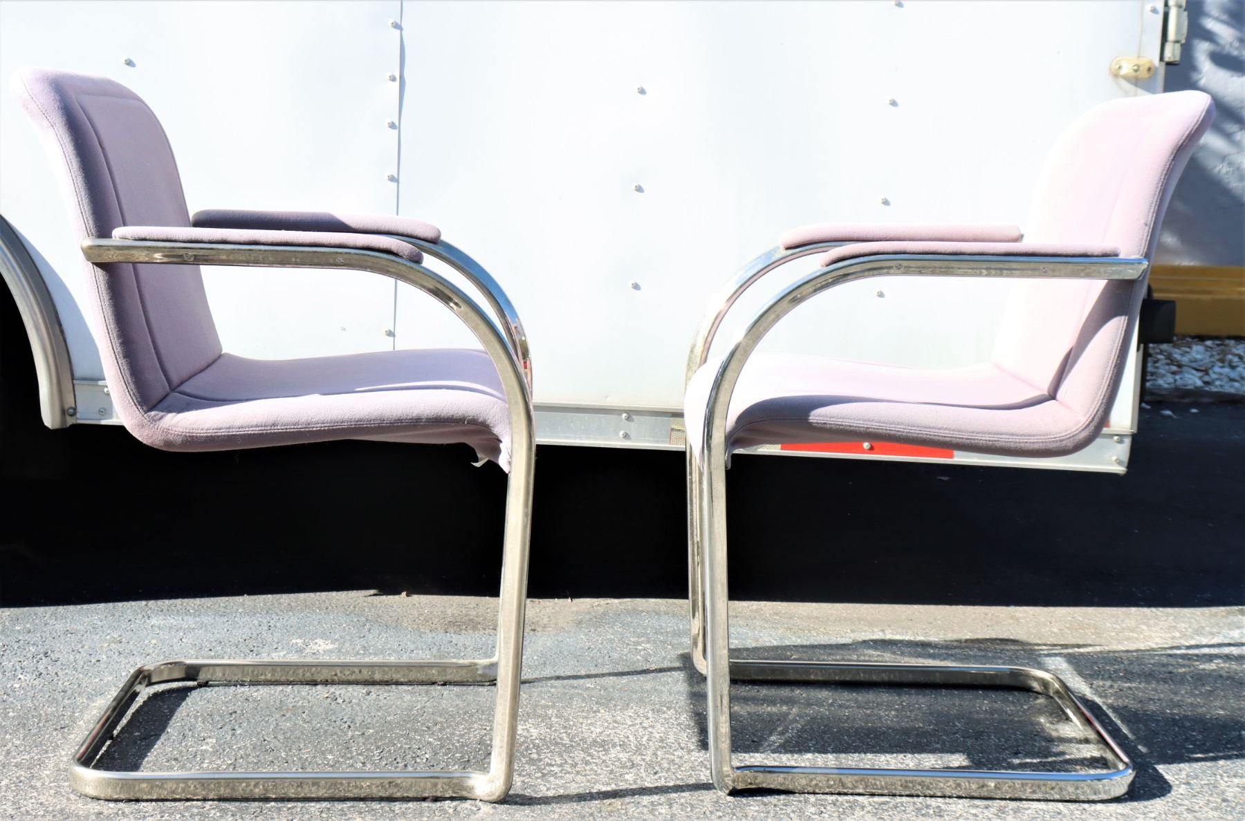 Two Thonet chairs in a flat tube aluminum with interesting arm detail. Upholstered in mauve-colored fabric.