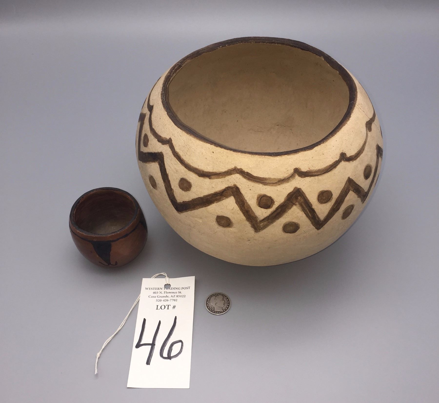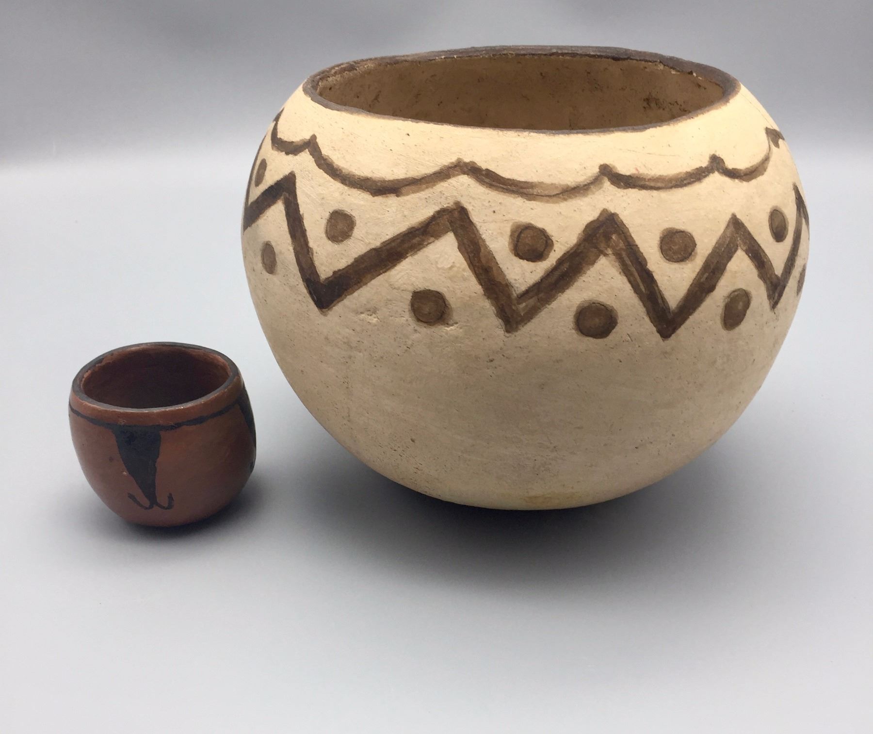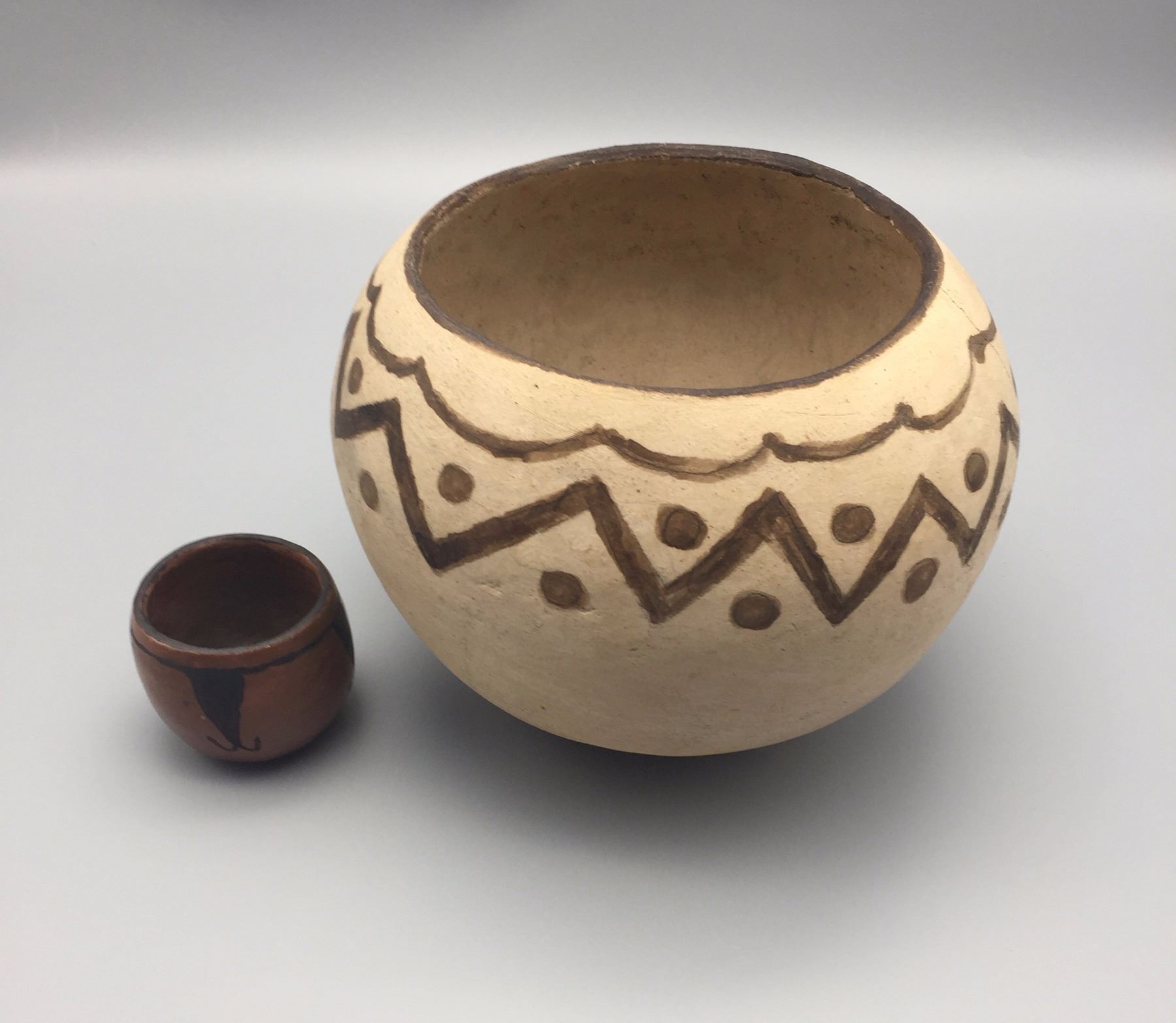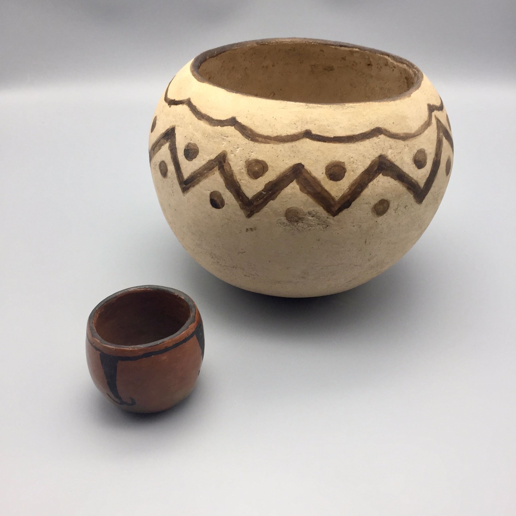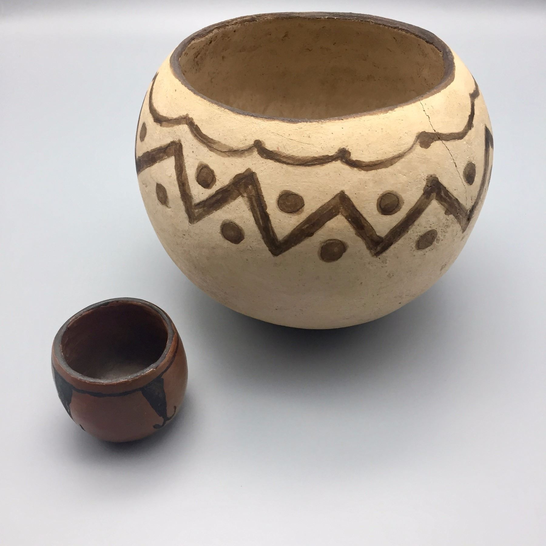 Maker: Unknown Tohono O’odham potters. Approx. Age: Circa 1970s. Size: 1) 9” w x 7”h. 2) 2 1/2” x 2 1/2”. Additional Info: Two handmade/hand-painted pots by unknown TO potters. Condition: Pretty good for their ages, normal wear and fading expected and the larger pot has a hairline crack near the rim. Please look closely at the pictures - they are an important part of our description. Shipping: There will be a $10 handling / packaging fee for shipping this lot. The actual cost of postage will be added on top of that.