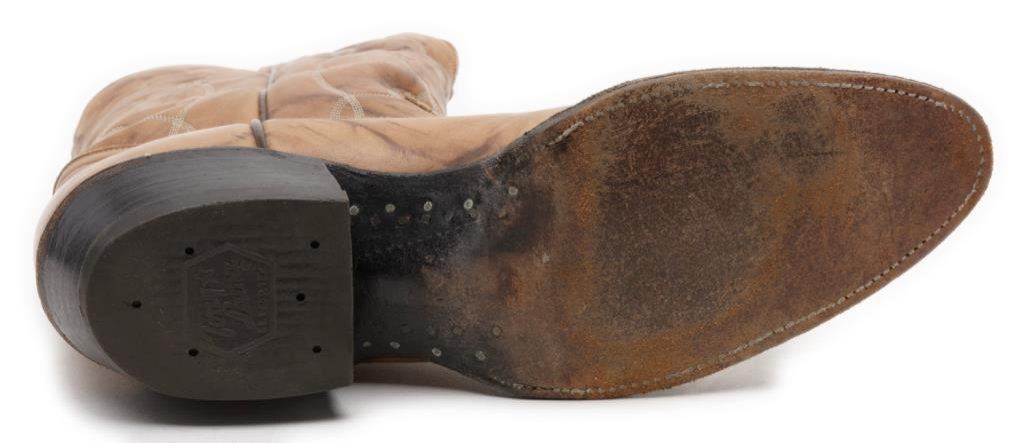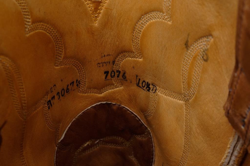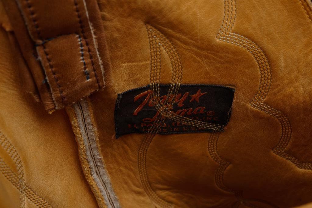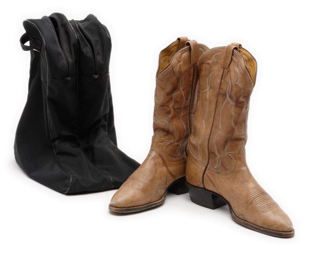 Pair of Tony Lama cowboy boots in size 10-1/2 D with storage spreaders and canvas carry bag; in overall good to very good condition. Est.: $50-$75.