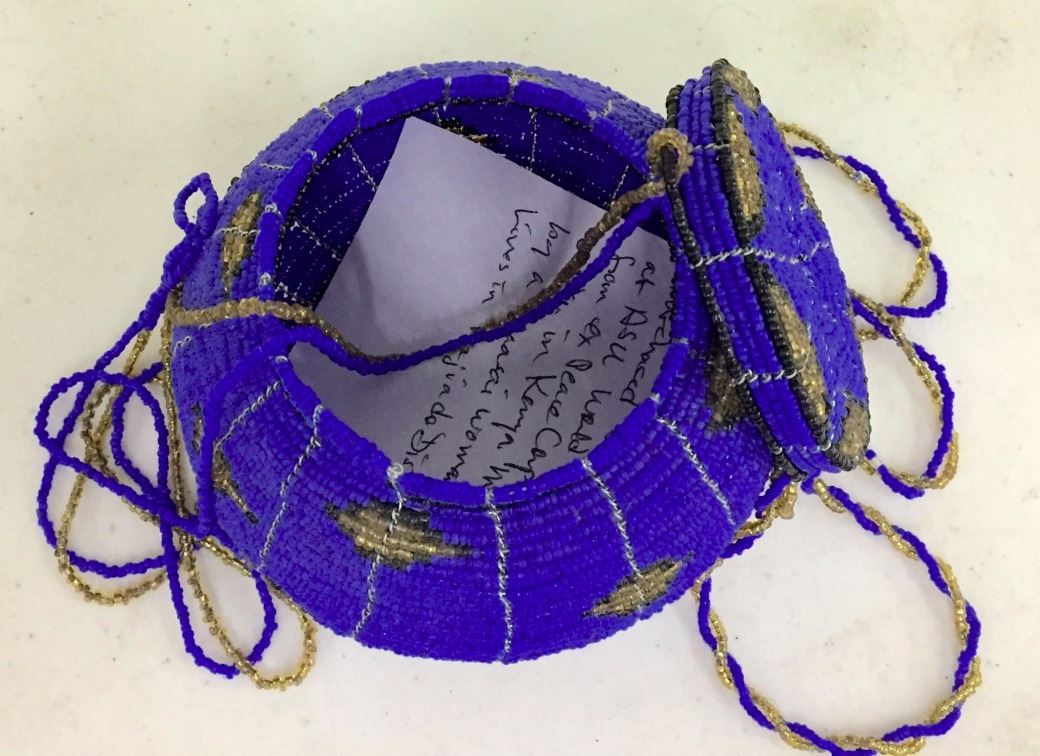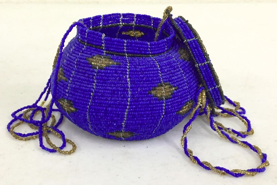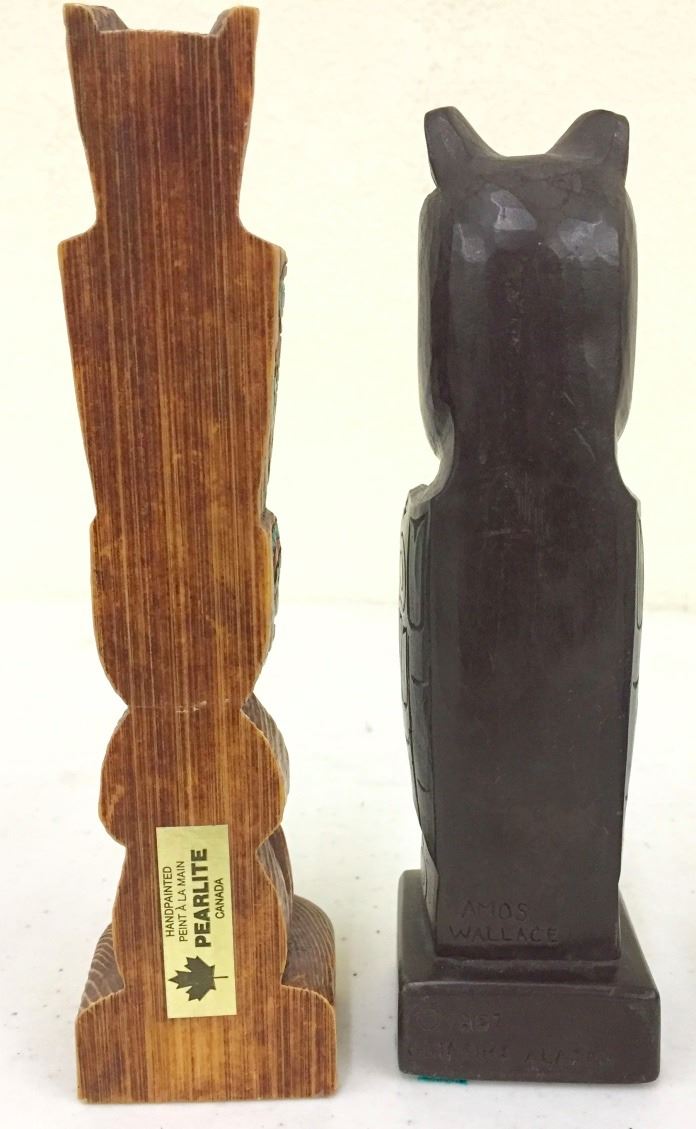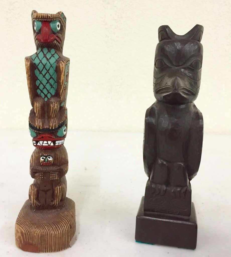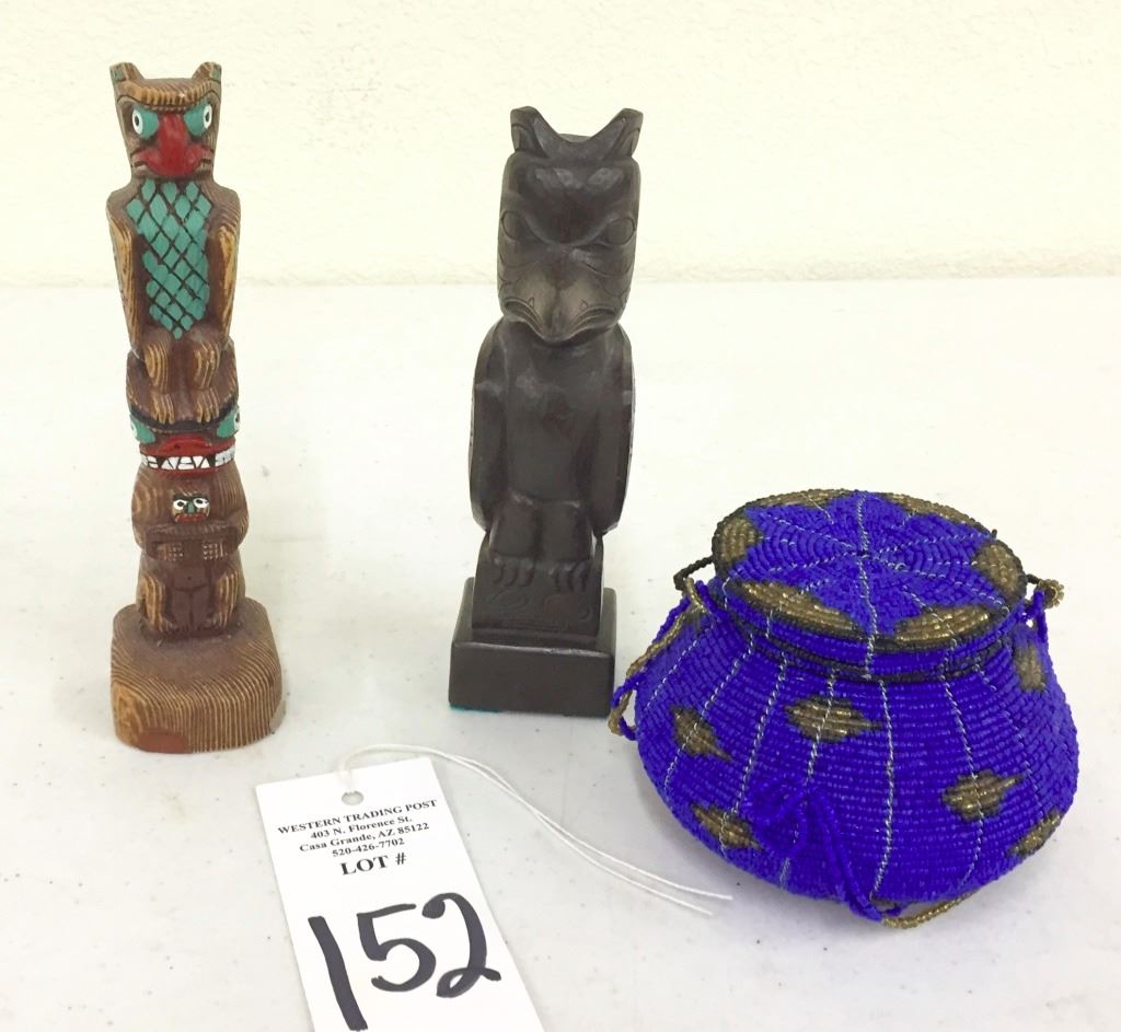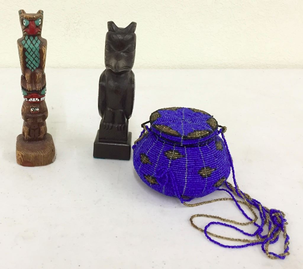 The two totem poles stand approximately 7.5 inches tall each. Canadian made. Composite Materials. The beaded jar was made by a Massai woman and was purchased by its owner in Kenya. Measures 4.5 inches wide by 3 inches deep. Please look closely at pics - they are an important part of our description. Shipping: There will be a $7 handling / packaging fee for shipping this lot. The actual cost of postage will be added on top of that.