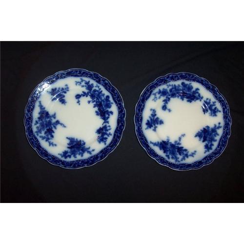 Tourine flow blue plates by Stanley Pottery company. Circa 1920.  Plates are 8 3/4" and have a beautiful floral pattern.  Scalloped edges.  Plates have 2 very small chips on back side of edge that is not visible from the front of the plates.  Very good condition.