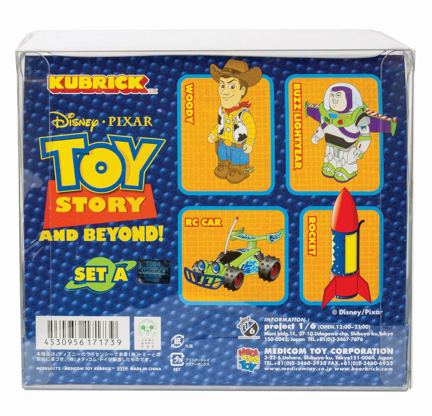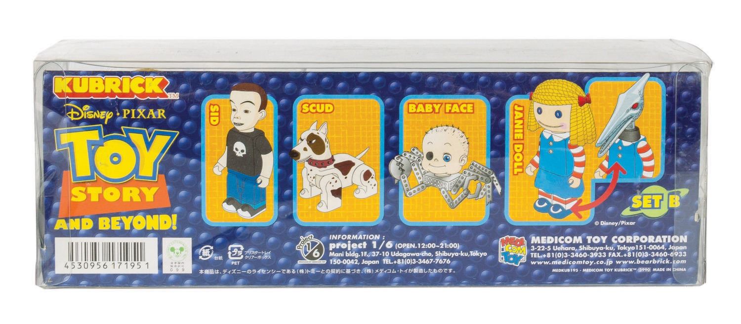 (Pixar, 2004-05) An original Set A and Set B from the Toy Story and Beyond! line of Kubrick block figures manufactured by Japanese toy company MediCom. Set A includes Woody, Buzz Lightyear, RC Car, and a rocket, and Set B consists of Sid, Scud, Baby Face, and Janie Doll plus an alternate pterodactyl head. Both sets remain unopened inside the original cardboard and plastic packaging. Set A's box measures 6"x6.75" and 5.5" deep, and Set B's is 3.75"x11" and 3.25" deep. Both exhibit light handling wear.