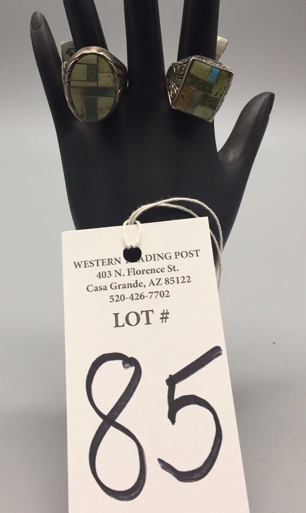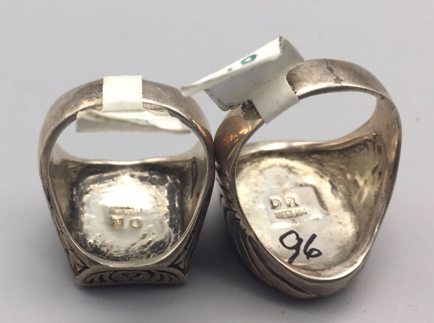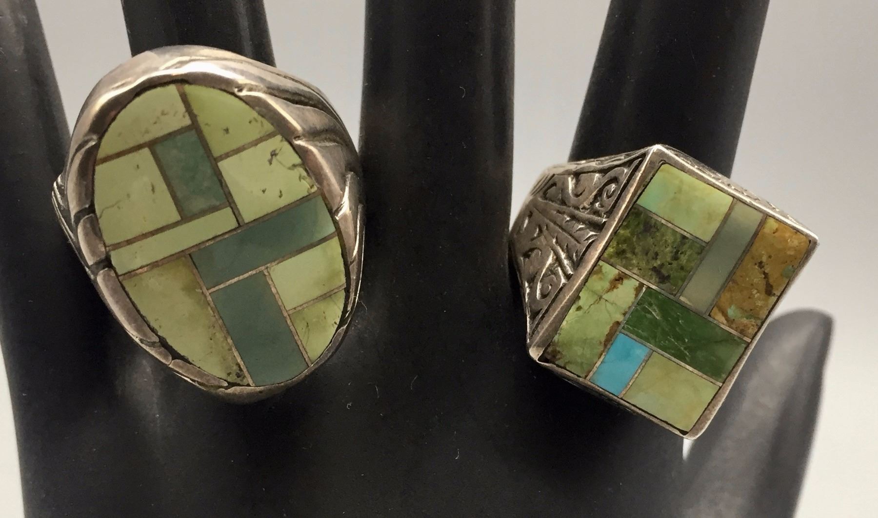 Maker: Unknown, both are hallmarked DR. Approx. Age: Fairly modern. Size: 10.5 and 12.5. Together they weigh 31.3g. Condition: Good, normal wear expected. Additional Info: Turquoise inlay set in sterling silver. Please look closely at the pictures - they are an important part of our description. Shipping: There will be a $5 handling / packaging fee for shipping this lot. The actual cost of postage will be added on top of that.