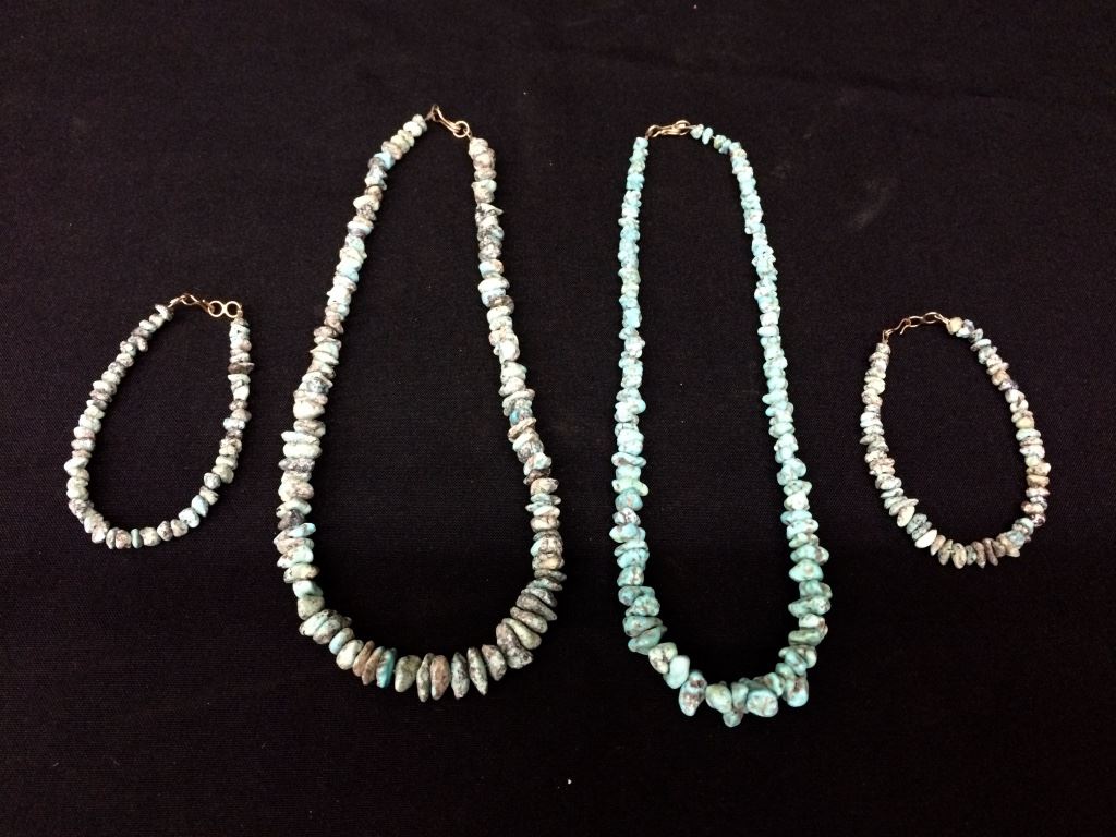 You get a pair of turquoise nugget necklaces with matching bracelets (4 pieces) all for 1 money in this lot! The necklaces fit approx. 16” around the neck and the bracelets are 7” long each. Good condition. Shipping: There will be a $5 handling / packaging fee for shipping this lot. The actual cost of postage will be added on top of that.