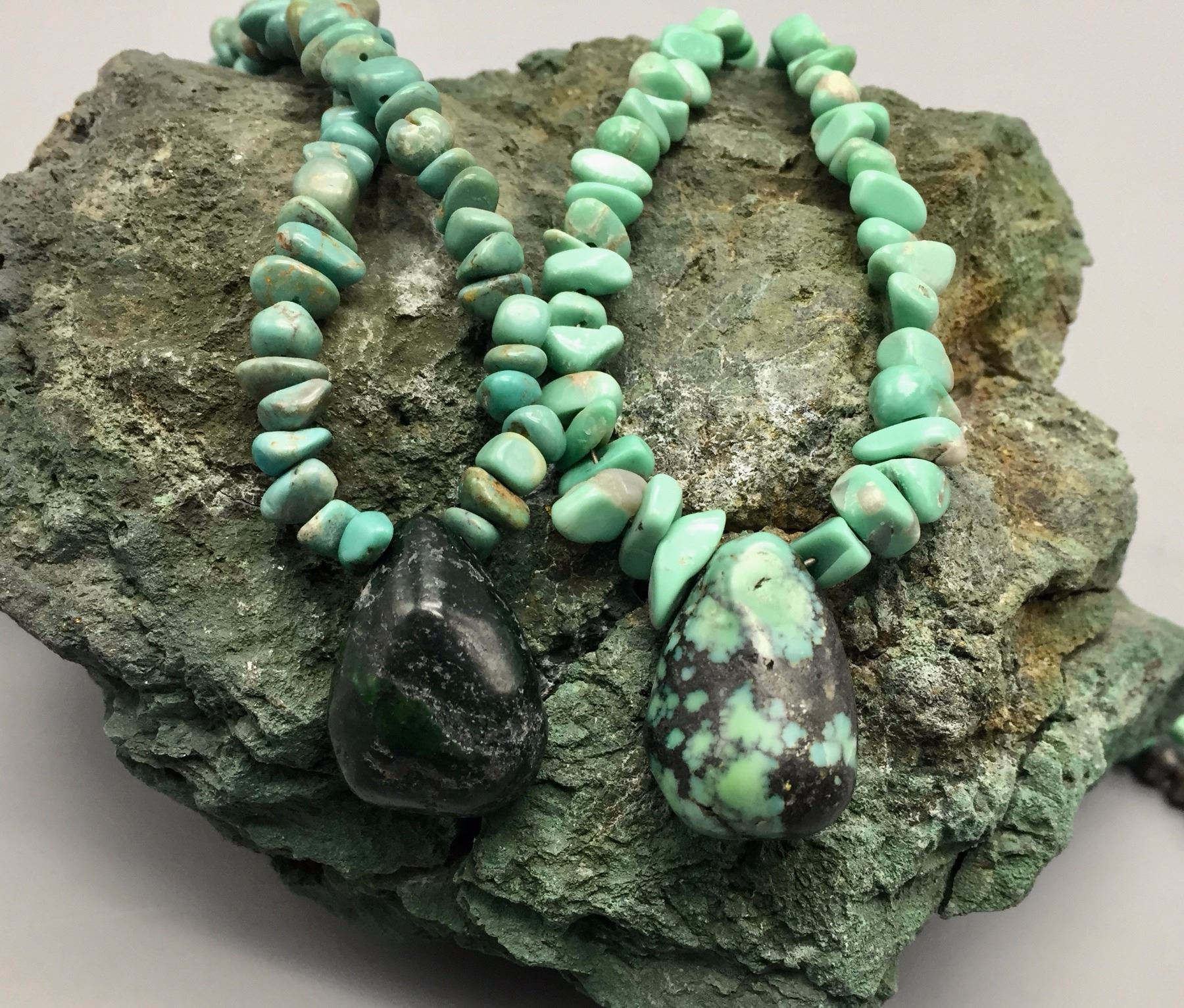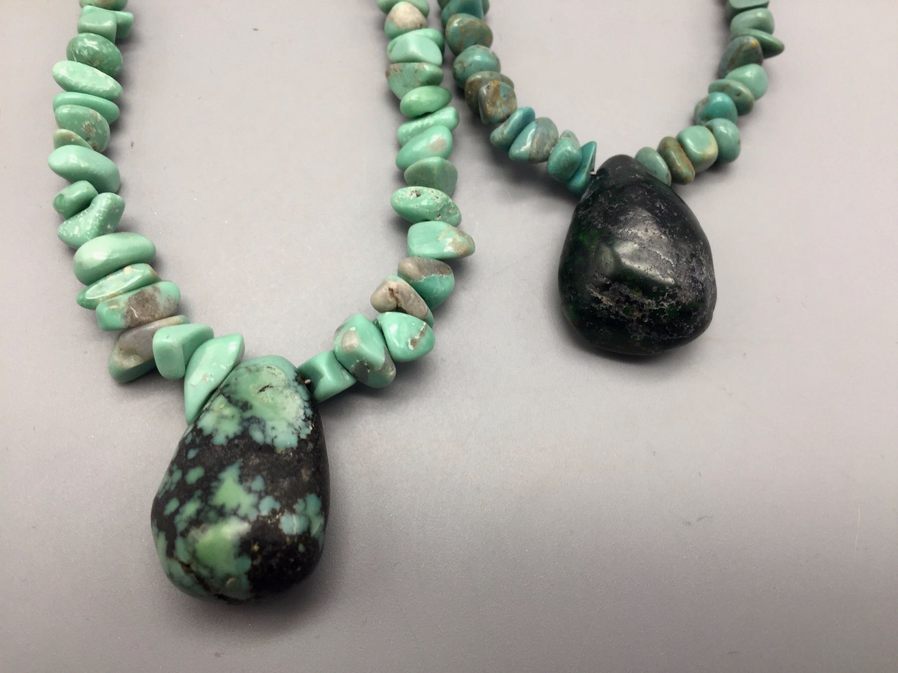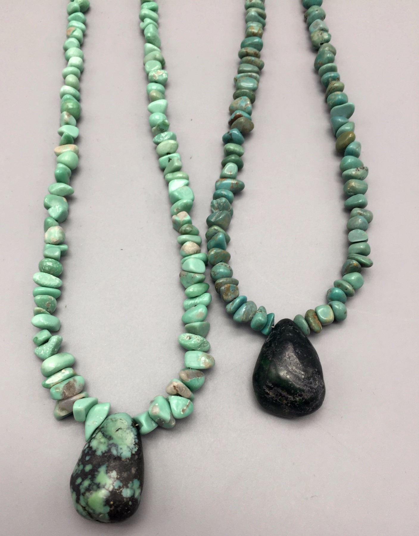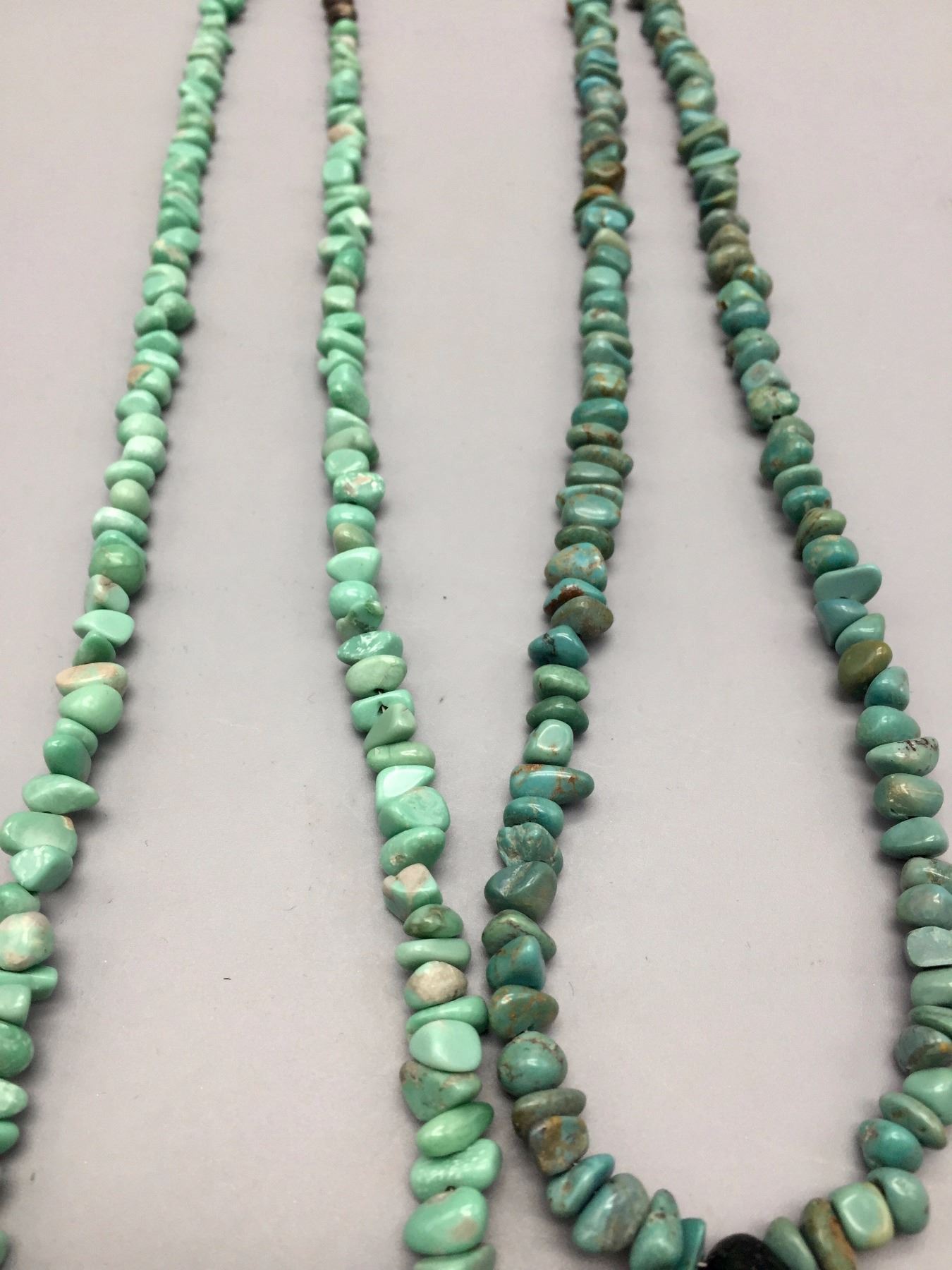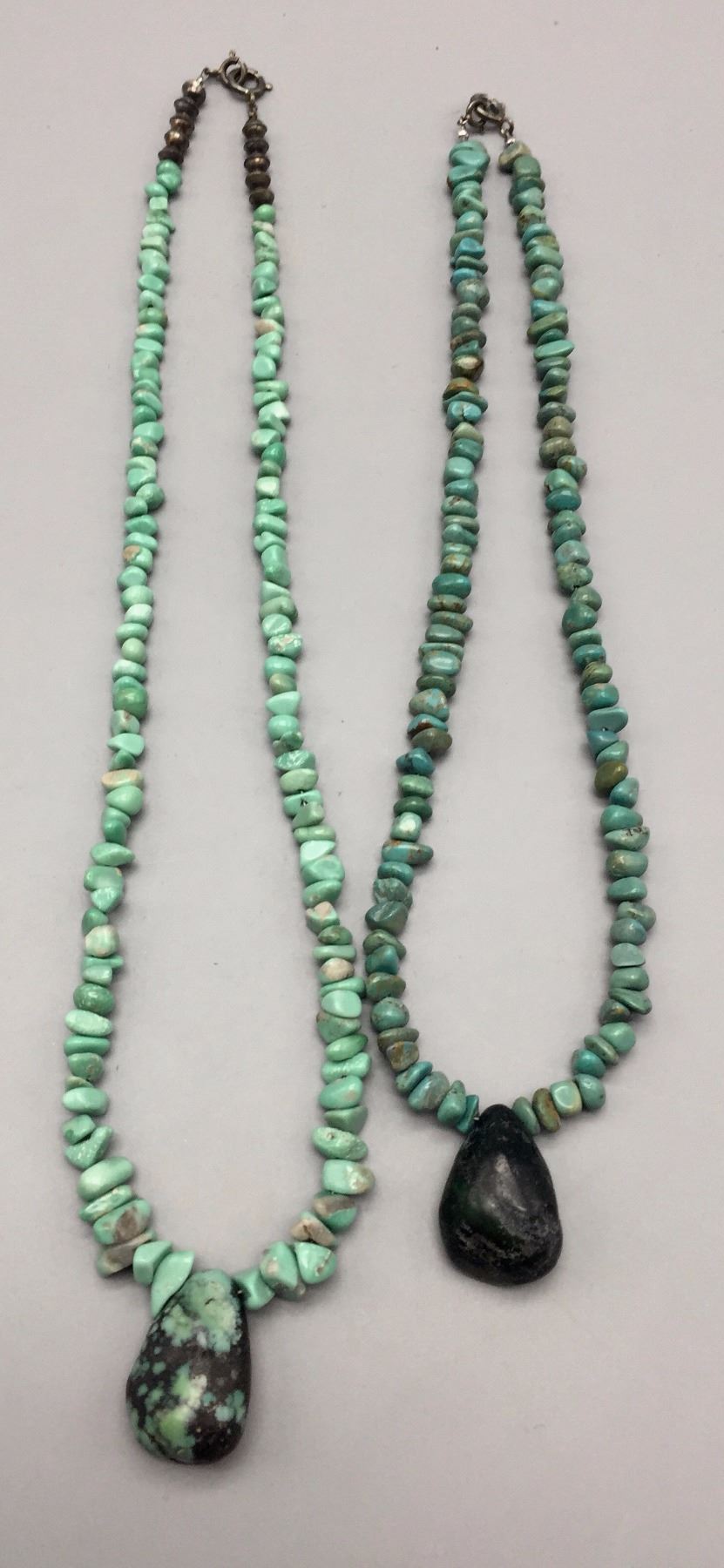 Maker: Unknown. Approx. Age: Fairly modern. Size: Each fits approx. 18” around the neck. Condition: Good, normal wear expected. Additional Info: Greenish colored turquoise nuggets with sterling findings. Please look closely at the pictures - they are an important part of our description. Shipping: There will be a $5 handling / packaging fee for shipping this lot. The actual cost of postage will be added on top of that.