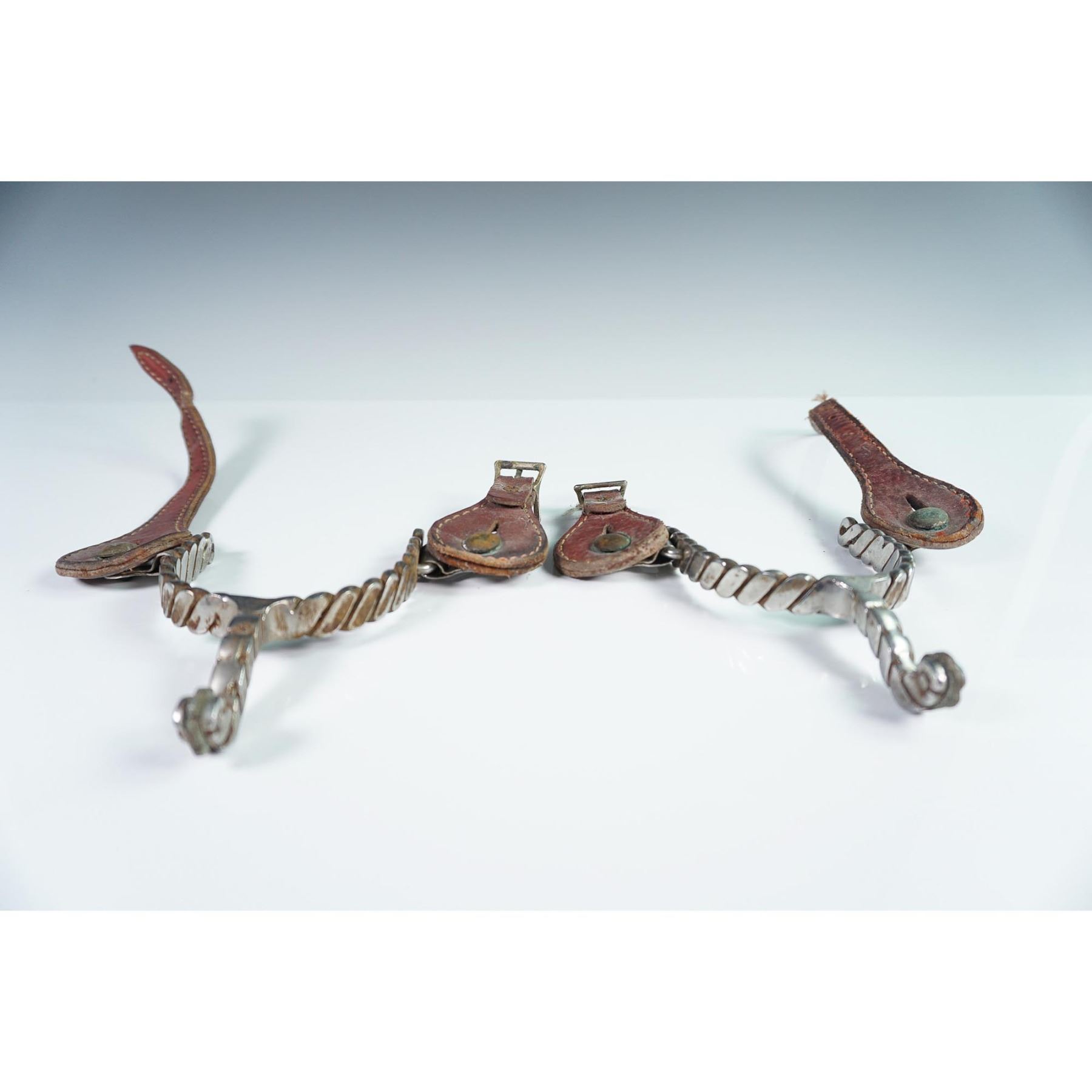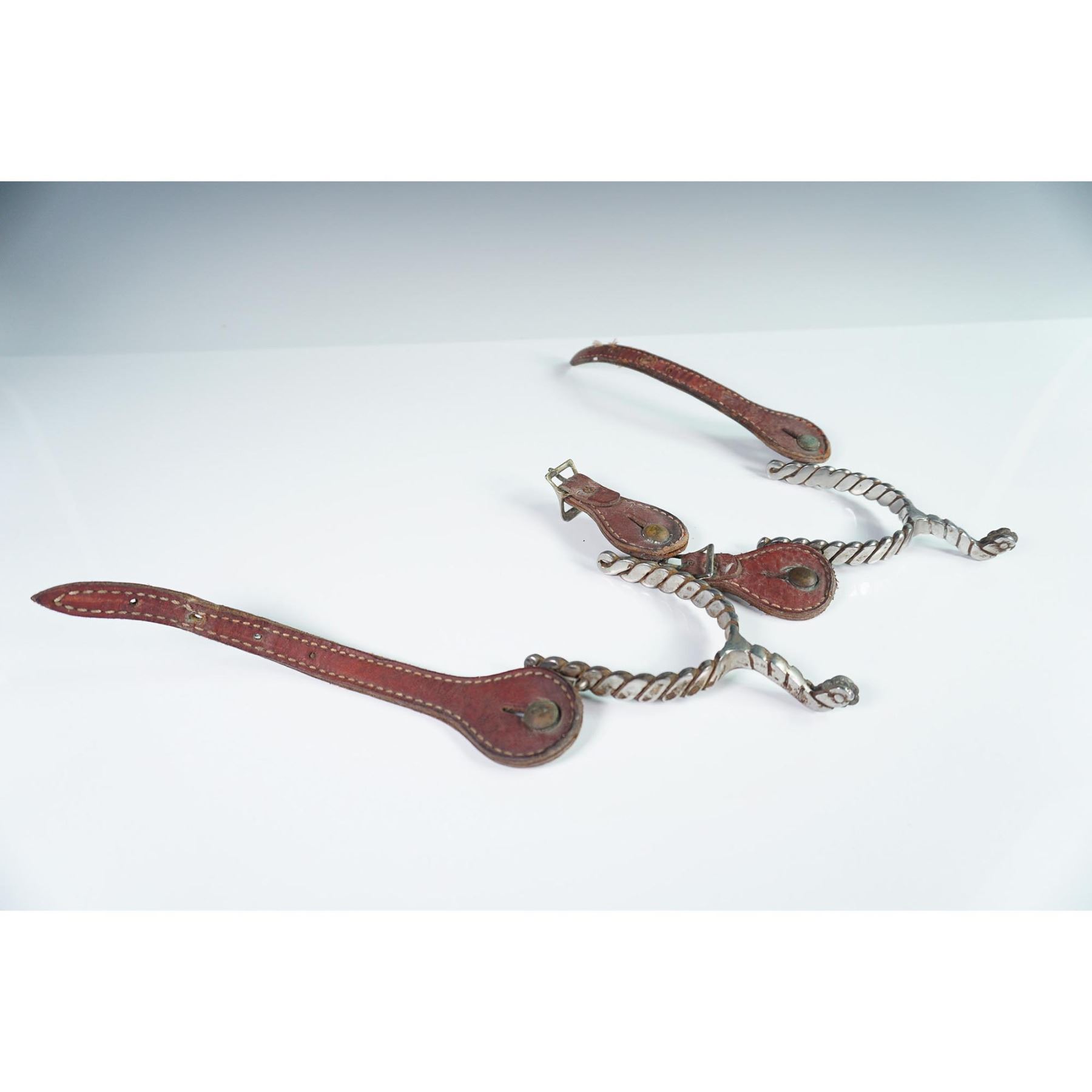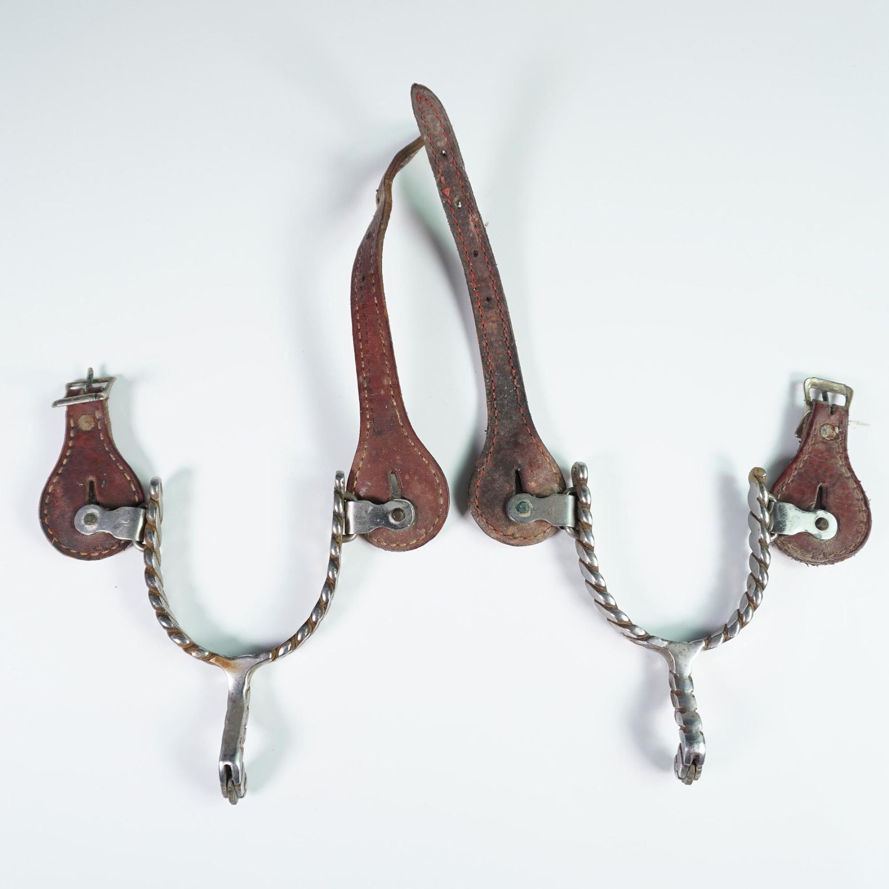 This pair of vintage Western riding spurs features twisted steel shanks and rowels, accompanied by original leather straps with stitched detailing and buckle closures. The design reflects traditional craftsmanship, with curved shanks and attached necks ending in small rowels for effective rider signaling. The spurs show wear consistent with age and use, suggesting possible early to mid-20th century origin. Each spur is fastened with reddish-brown leather straps that appear hand-stitched and show patina and verdigris on the brass hardware. These would be a fine addition to any Western or equestrian collectible display.
