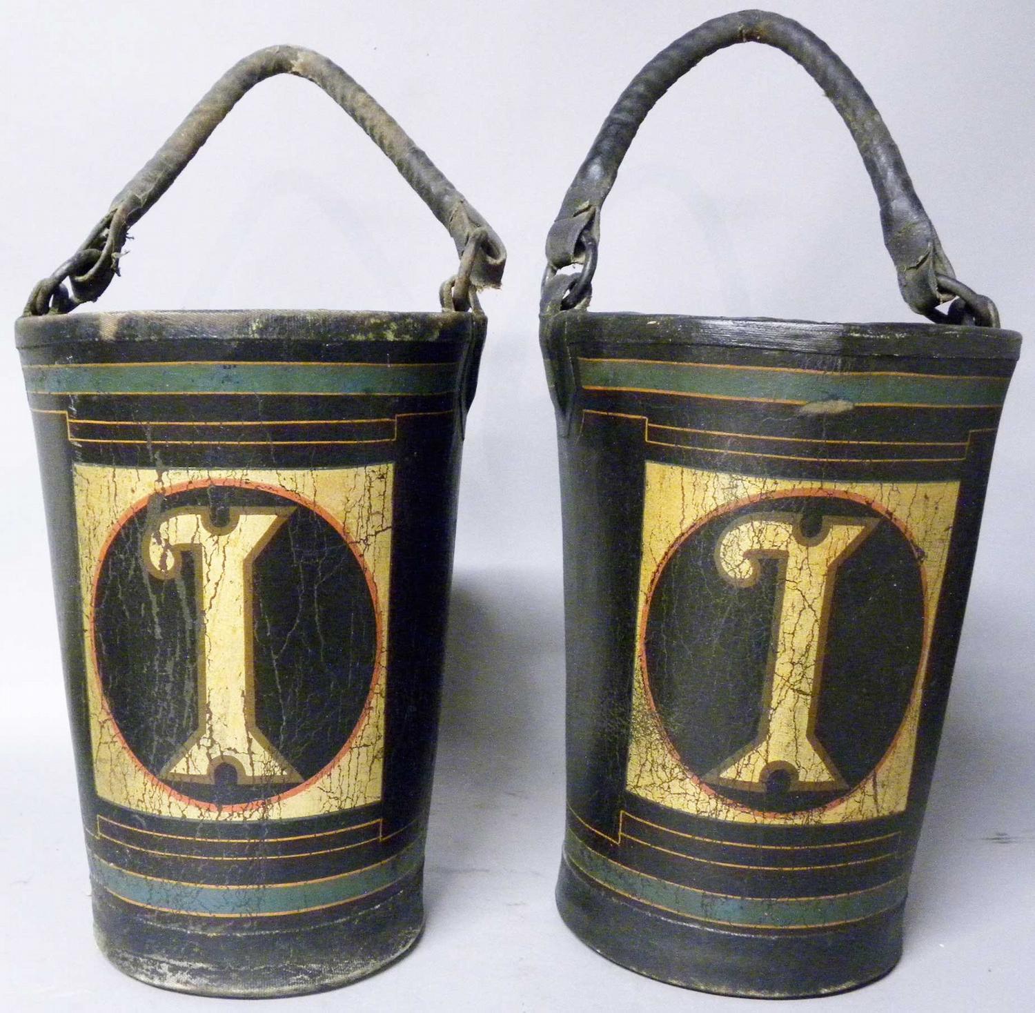 Pair of Two Matching Leather Fire Buckets "1". Original stenciling and bales. Excellent condition. 13 inches tall w/o bale.