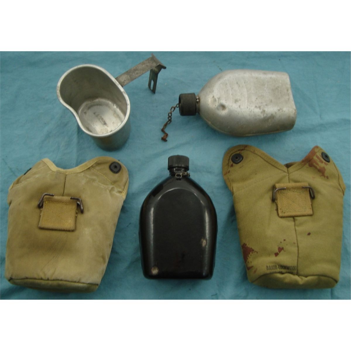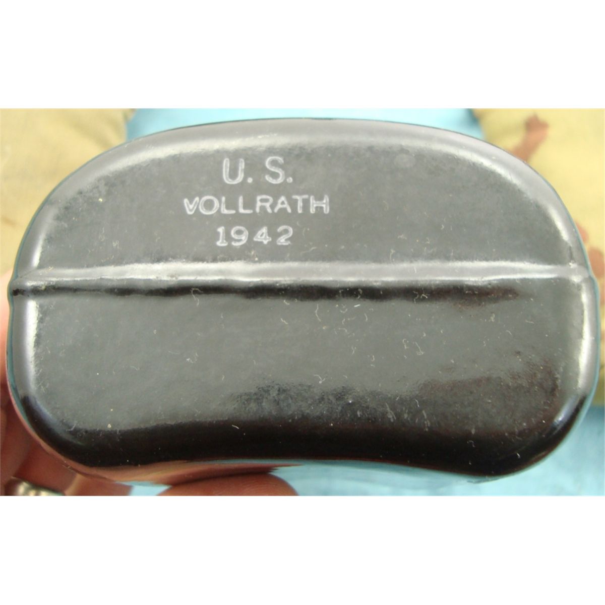 Early US enamel canteen marked "US Vollrath 1942". Has 1941 cup & is in British made cnateen cover. Standard US 1944 dated canteen, no cup w/canvas cover.
