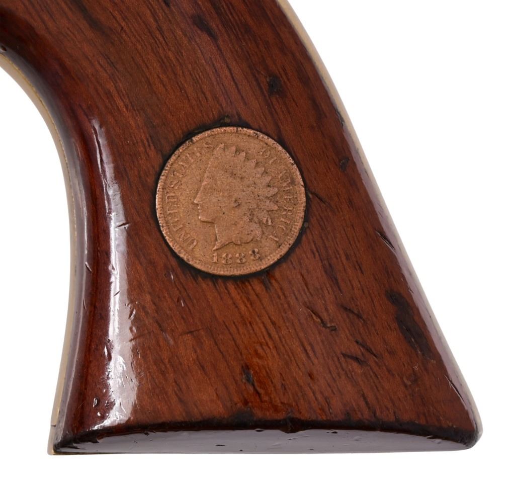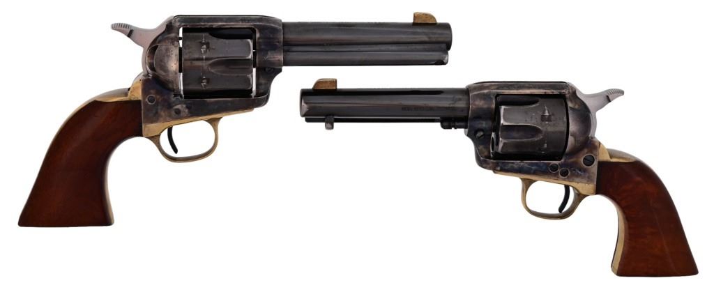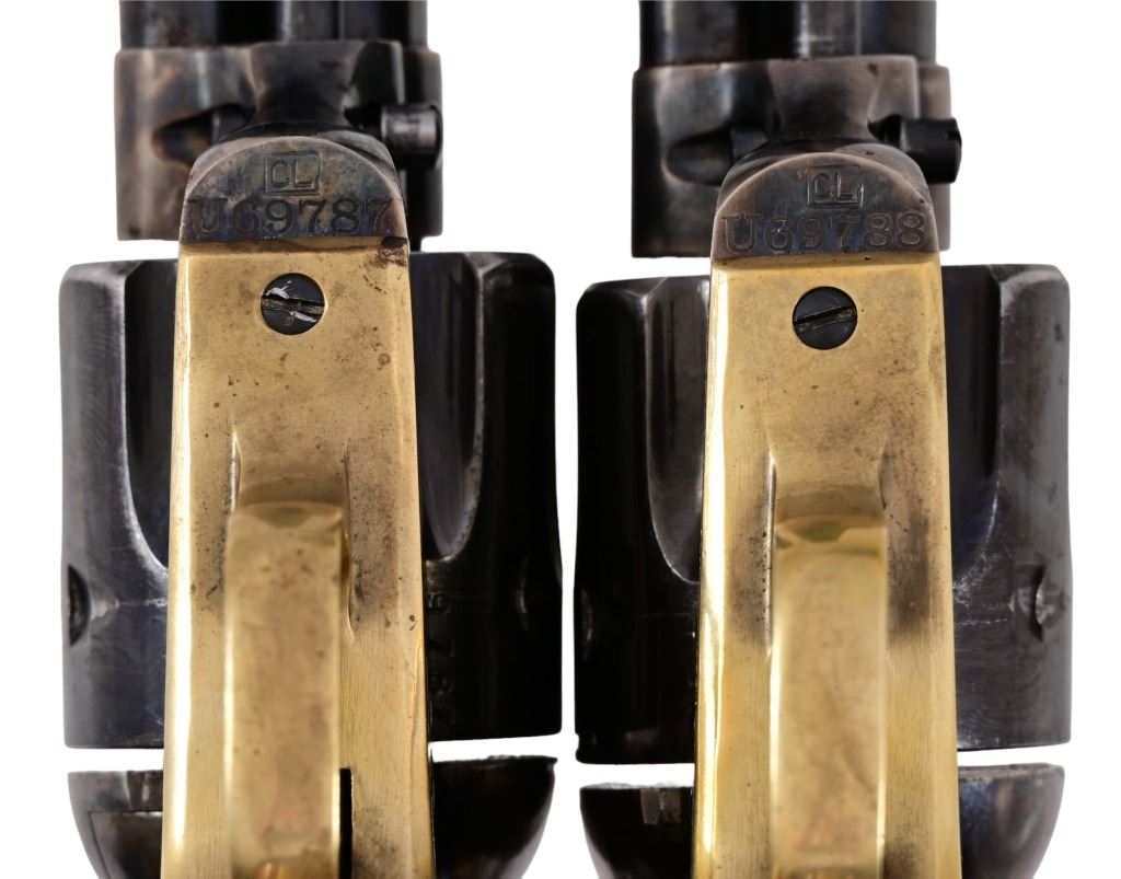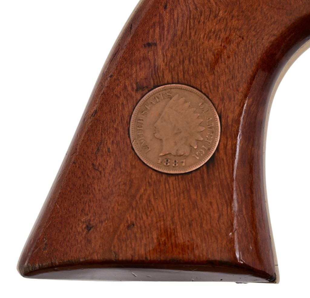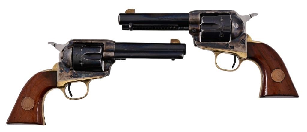 Sequential Serial Numbers U69787/ U69788. Case hardened frame, 357/38 cal. Genuine Indian Head pennies set in walnut grips. The last two digits of gun serial number matches year of pennies set in grip. All new screws and spring work, make for very nice action and trigger pull. A pair of very nicely done Uberti SAA revolvers
