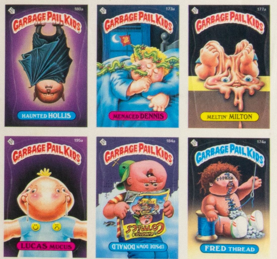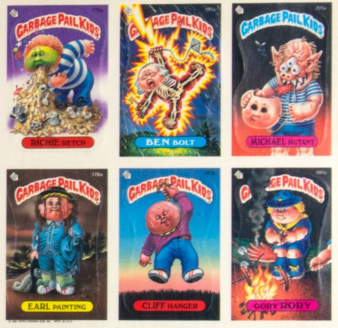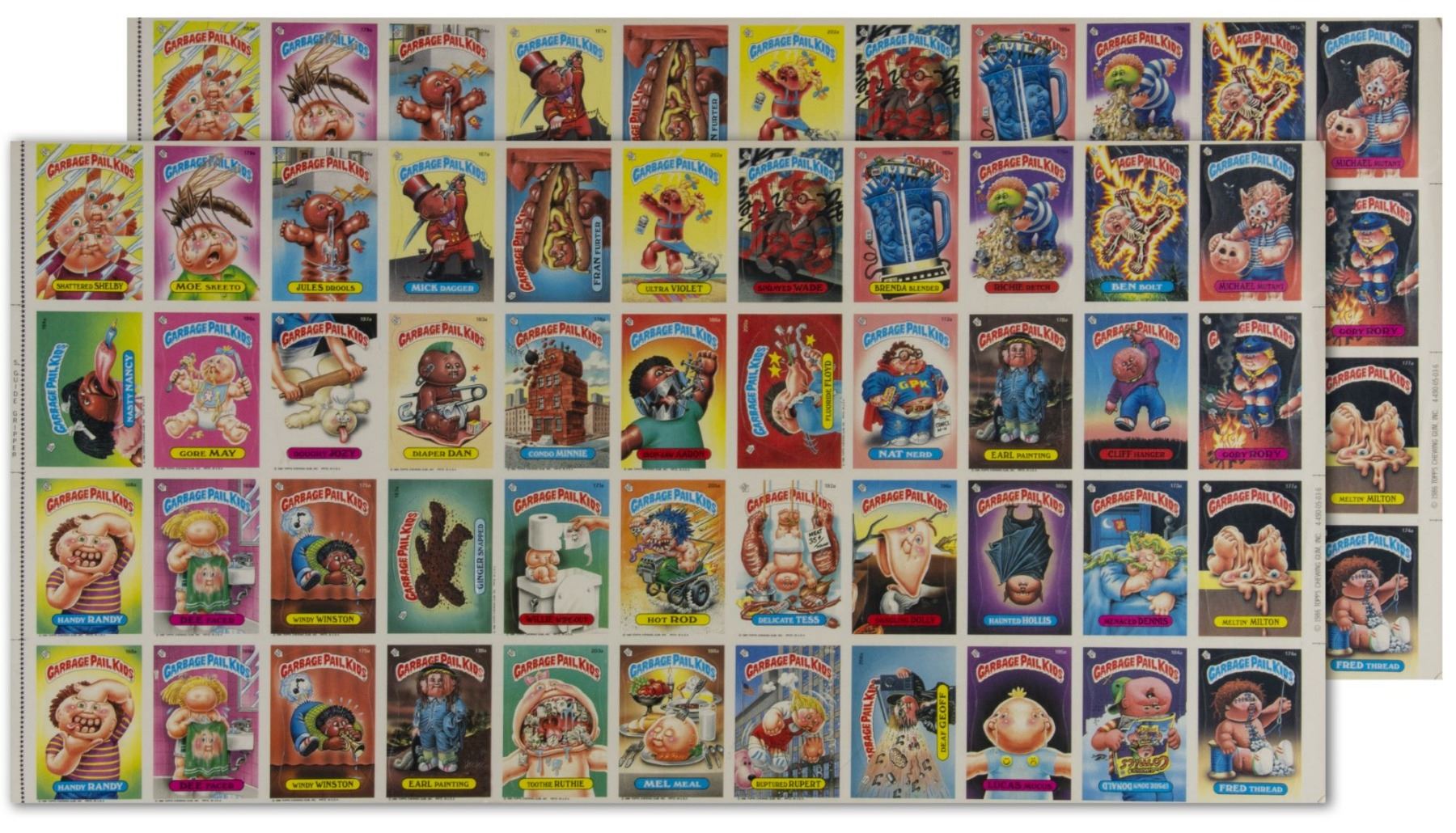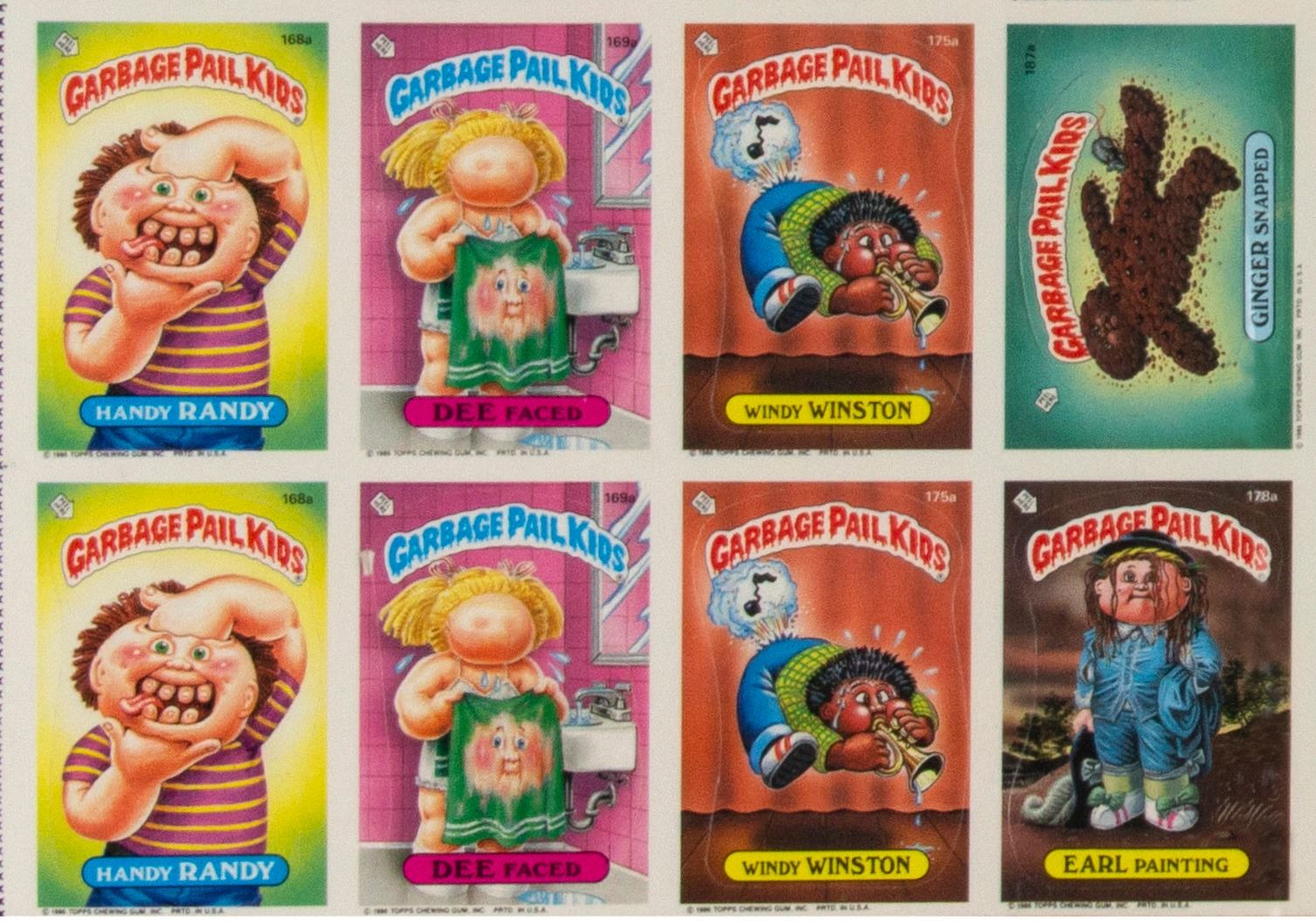 (Topps, 1986) A rare pair of large uncut sheets of "Garbage Pail Kids" collectible trading cards. These iconic trading cards of the 1980s feature stickers in the center which can be peeled off the card, however these sheets contain fully intact cards with unpeeled stickers. The front sides of these two sheets contain matching card imagery, however the reverse sides depict two large cards: "Dee Faced" and "Handy Randy". The sheets measure 14"x28.75" each, and the pair is in fair to good condition with some edge wear and minor creasing throughout.