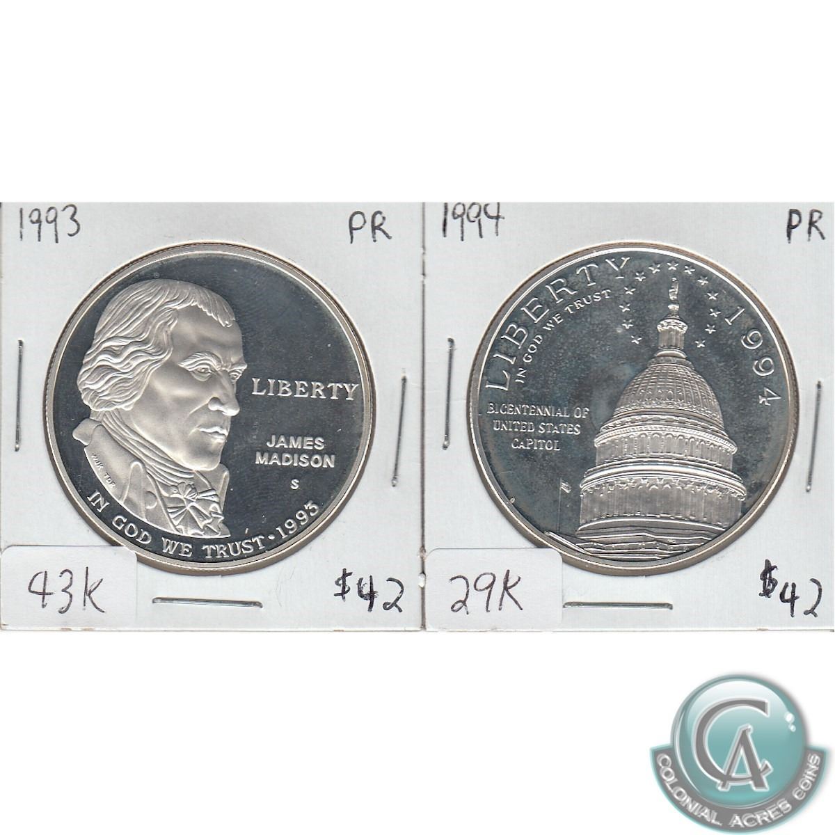 Pair of United States Commemorative Silver Dollars. Dated 1993 & 1994, in Proof condition. 2 pcs