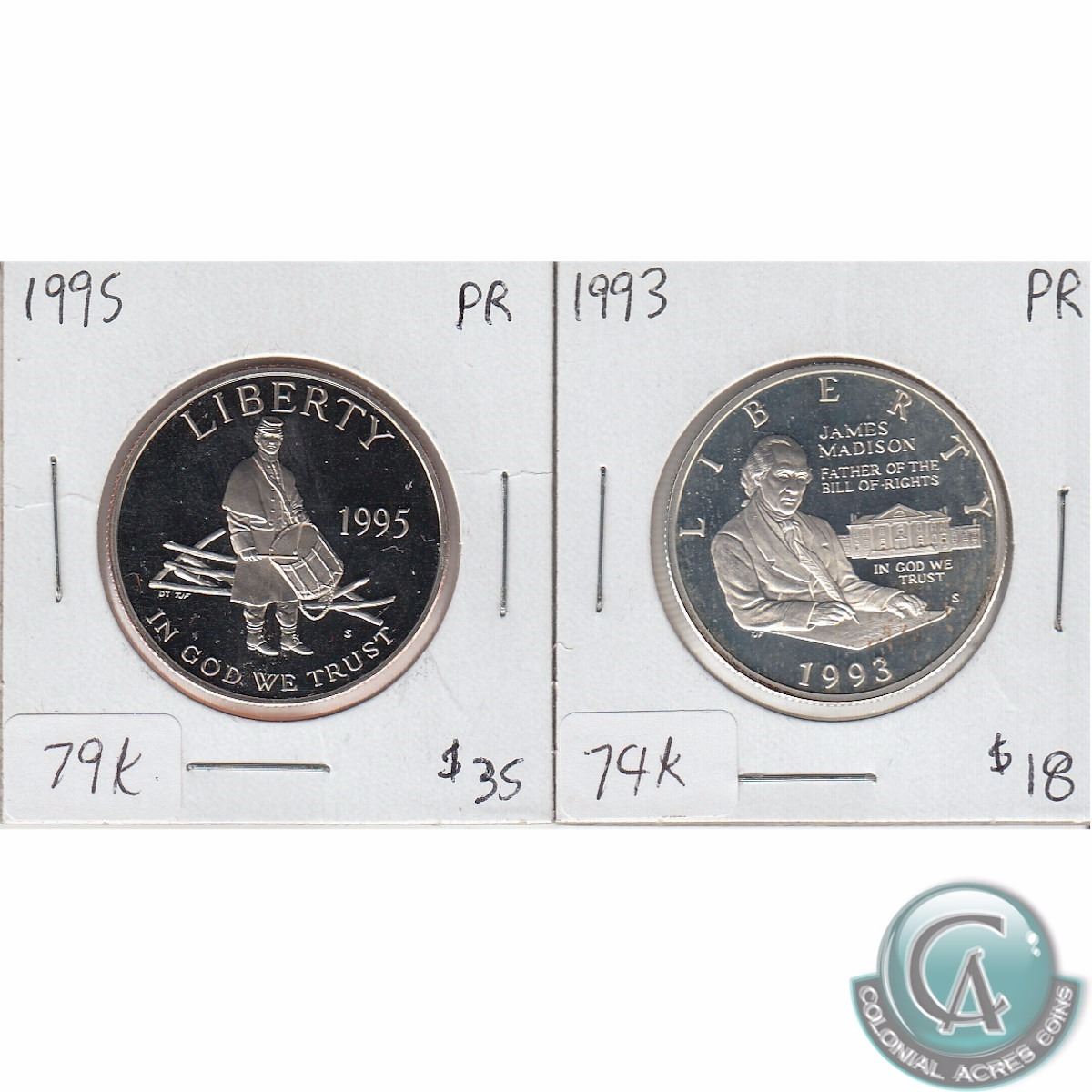 Pair of United States Commemorative Silver Half Dollars. Dated 1993 & 1995, in Proof condition. 2 pcs