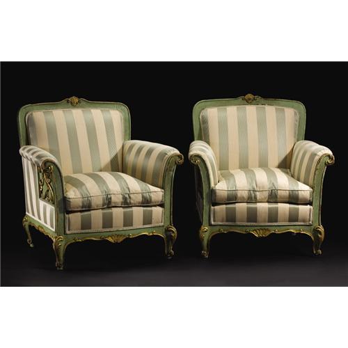 <B>A Pair of Upholstered Rococo-style Venetian Armchairs</B></I><BR><BR>Unknown maker, Venice, Italy<BR>Nineteenth Century<BR>Painted wood<BR>Unmarked<BR>34.5 inches high<BR><BR>Gilt with green paint with shell carving at crest rail. Each chair has inset carved panel beneath each scrolled arm, upholstered with cream and light green silk fabric.<BR><BR> <B>Condition Report:</B> Minor losses to carving and paint.<BR><BR><b>Shipping:</b> Requires 3rd Party Shipping (<a target="_blank" href="http://www.heritageauctions.com/common/shipping.php">view shipping information</a>)