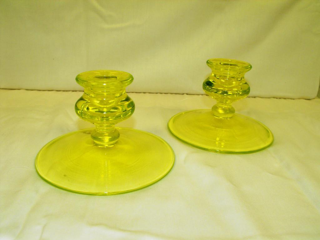 A nice pair of candlesticks made from Vaseline glass. 5 x 3