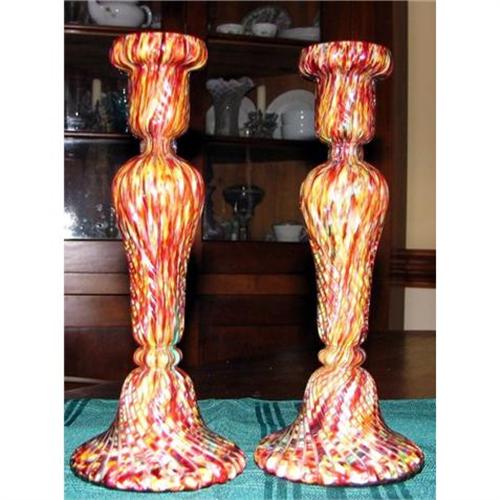 A wonderful pair of cased glass candlesticks, perhaps Davidson. This pair is exqusite in every way, the workmanship that went into these is unbelieveable! The colors are rich and vibrant, mainly a mocha color, with rich red and turquoise accents. They are hollow cased, there are three layers of glass, starting with the pure white interior, then they were rolled in the afore mentioned colors, then cased in a thick clear glass. I am no expert on these, so please feel free to correct me if I am wrong about the making process. The maker sure knew what they were doing, as every detail was paid attention to. They look like wood. The scallops in the glass are just perfect! There is a very minor flea bite on the inside rim of one, you can not see it, you can only feel it with your fingers. Please feel free to ask for additional pictures!