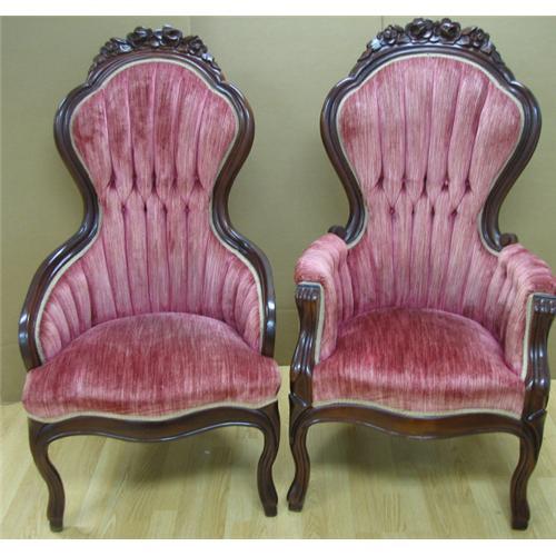 This is a pair of beautiful Victorian Parlor Chairs. This is a Gentleman and Lady Set circa 1880. The set is in Excellent Condition with little signs of exterior wear. Both chairs are covered in tufted medium rose colored velvet. The back of both chairs are upholstered in matching fabric. The chairs are bordered in Ecru color braided trim. The wood frame is handcarved and displays an intricate rose pattern. The Gentleman's Chair has tufted rolled velvet arms. It measures 48"H X 25"W X 25"D. The Lady's Chair measures 48"H X 24"W X 24"D.