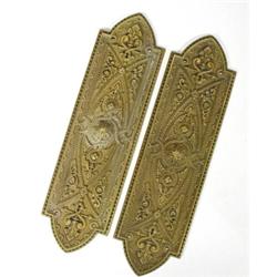 Pair of Victorian brass finger plates cast with swags and stylised flower heads, 26cm in length
