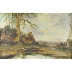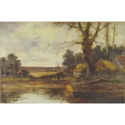 Pair of Victorian gilt framed oil on canvas of rural countryside scenes with cottages, ponds, chickens and people, indistinctly signed, each 50cm x 75cm