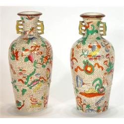 Pair of Victorian pottery vases hand coloured and transfer printed with oriental style flowers, implements etc, 17cm high