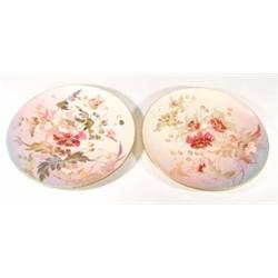 Pair of Victorian pottery wall plates, hand painted and gilded with flowers, 37cm diameter