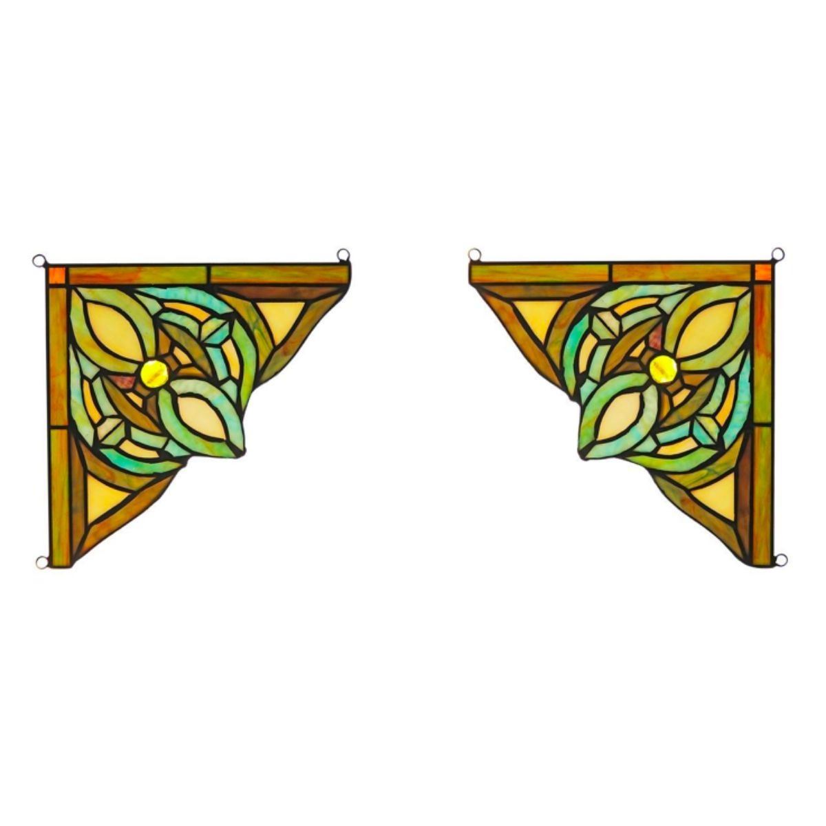 Pair of Victorian-style stained glass window panels, handcrafted from over 45 pieces of art glass in green & yellow colors. Handcrafted using the same techniques that were developed by Louis Comfort Tiffany in the early 1900s, each piece of glass wrapped in fine copper foil. 8"H X 8" W & 0.7 pounds each. Â