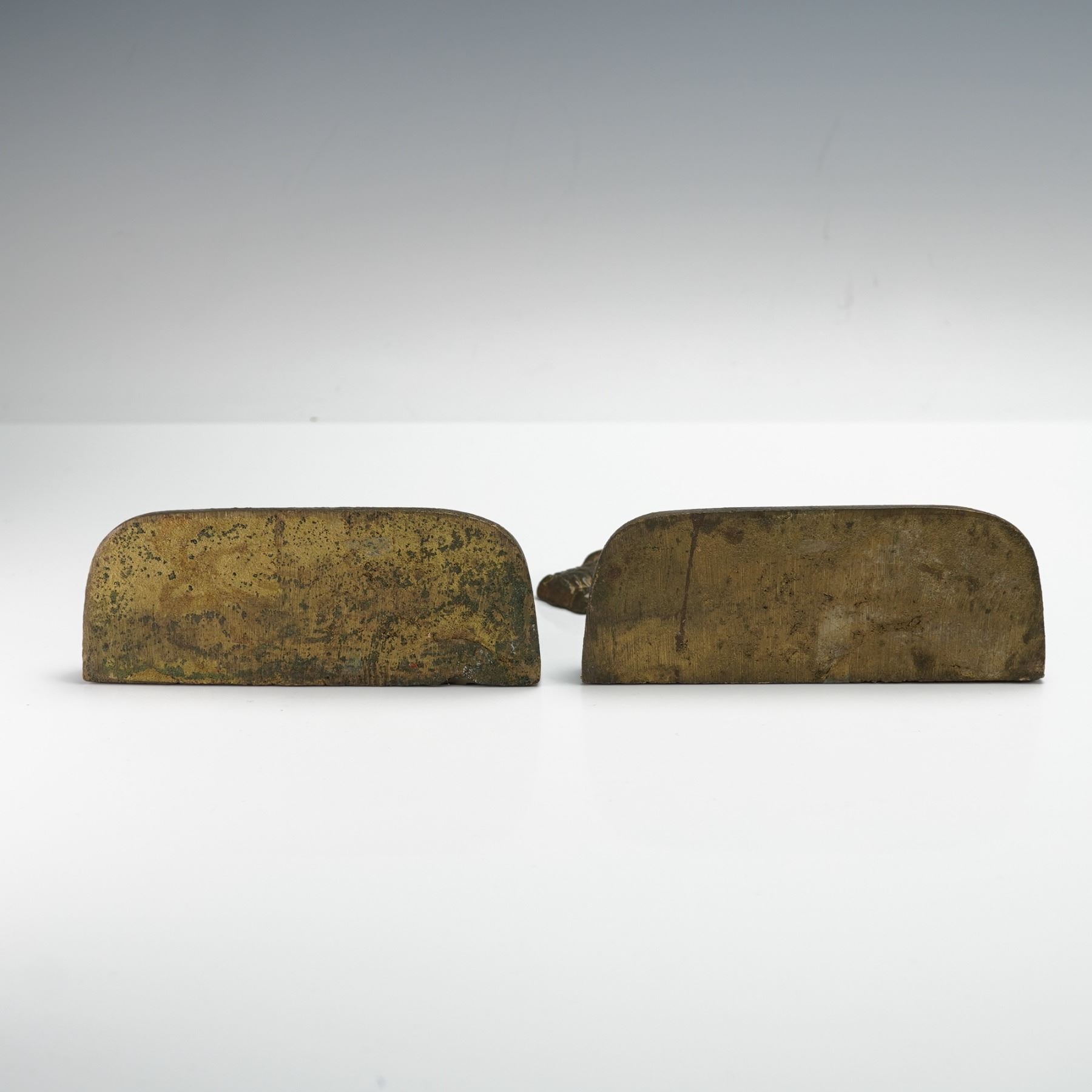 A charming pair of vintage cast iron bookends modeled as Scottish terriers, each finely cast with textured fur detail and standing alert on a rectangular base. Retaining an attractive aged patina consistent with age and use. Solidly made, these mid-20th century bookends combine practical weight with decorative appeal, ideal for dog enthusiasts or collectors of vintage metalware. 5.6 lb.