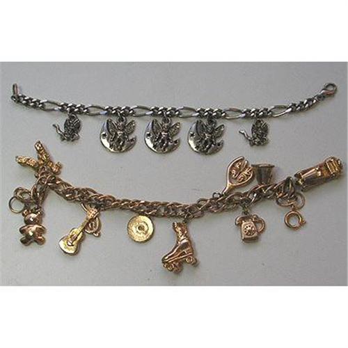 </font></strong>Pair of vintage charm bracelets - one silvertone charm bracelet features three central charms with winged cherubs or angels each seated on a sickle moon that has stars impressed on its surface. Two smaller outer charms have flying cherubs. Total length is 7 inches, making a 3.5inch diameter. Excellent used condition with lobster clawed safety clasp. - One gold tone charm bracelet featuring a guitar, tennis racket, skate, teddy bear, music note, and others charms on a linked bracelet with a clawed safety clasp also in excelent used condition.</font>