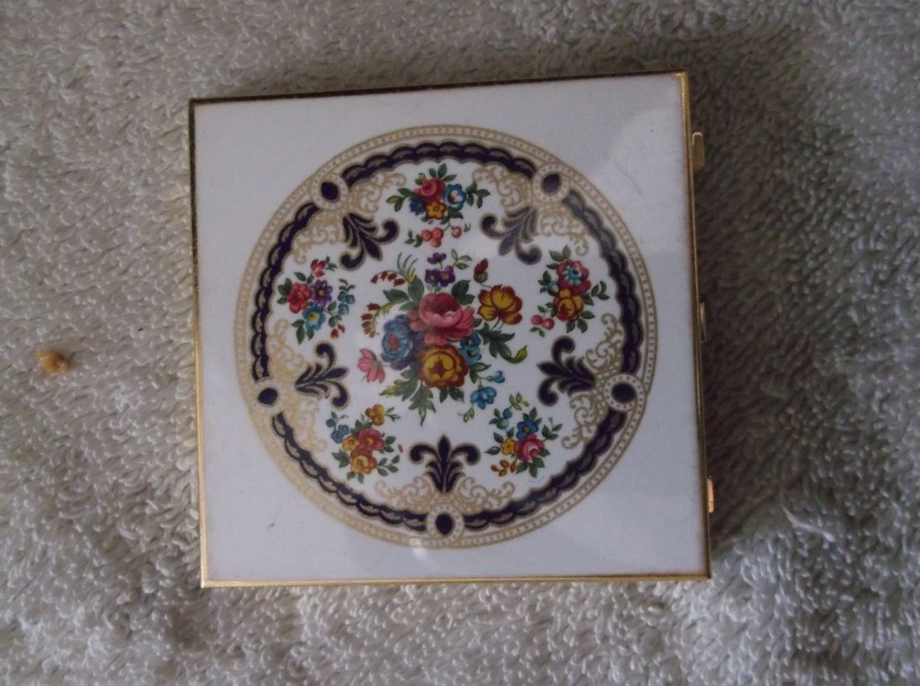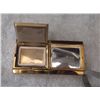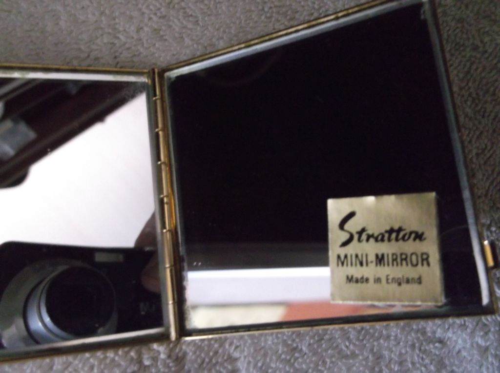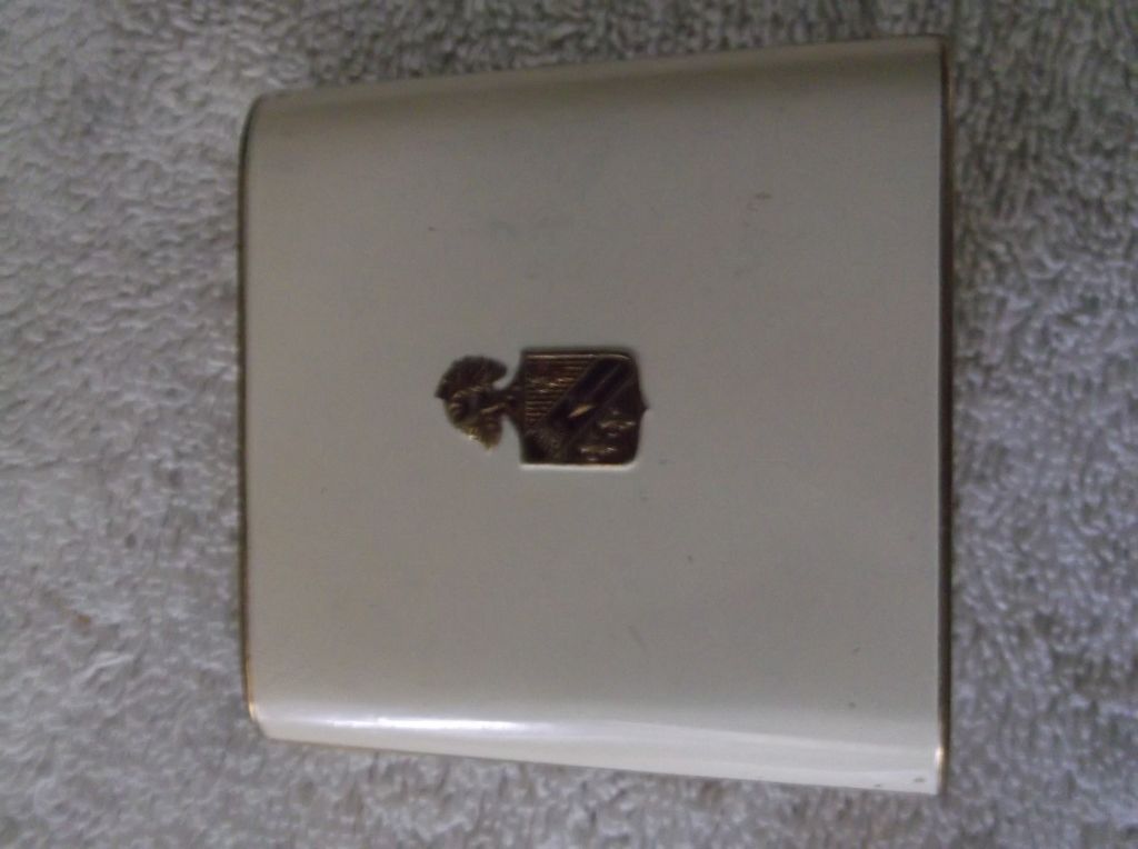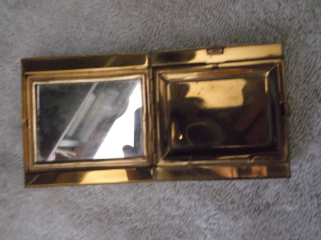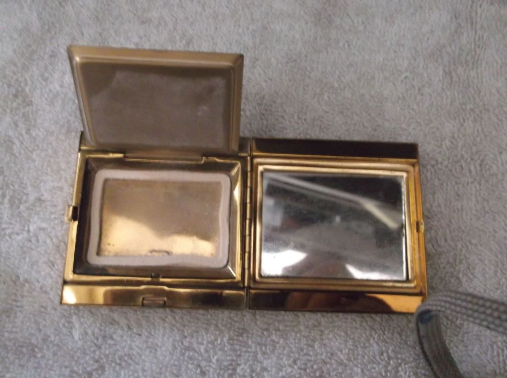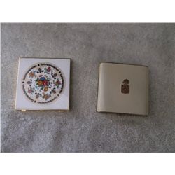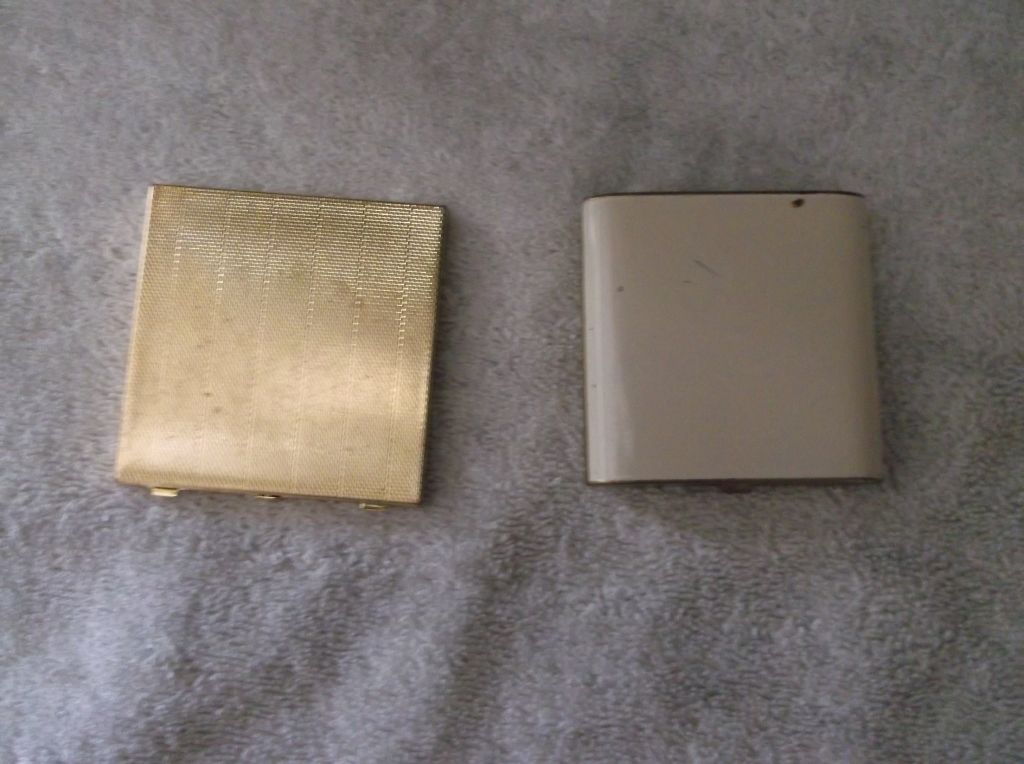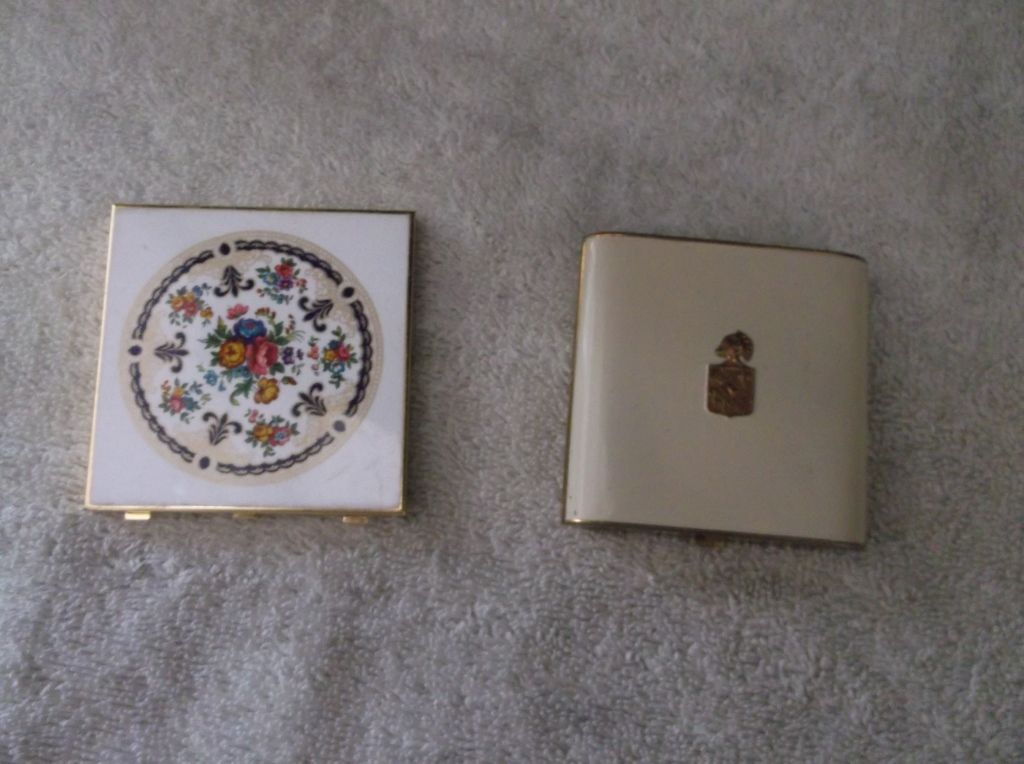 1- cream & Gold tone compact is with a mirror on one side and an opening for powder on the other side... back from about the 1940-1950's has a gold knight head and crest on top side of compact approx 2.5 x 2.5" 1-