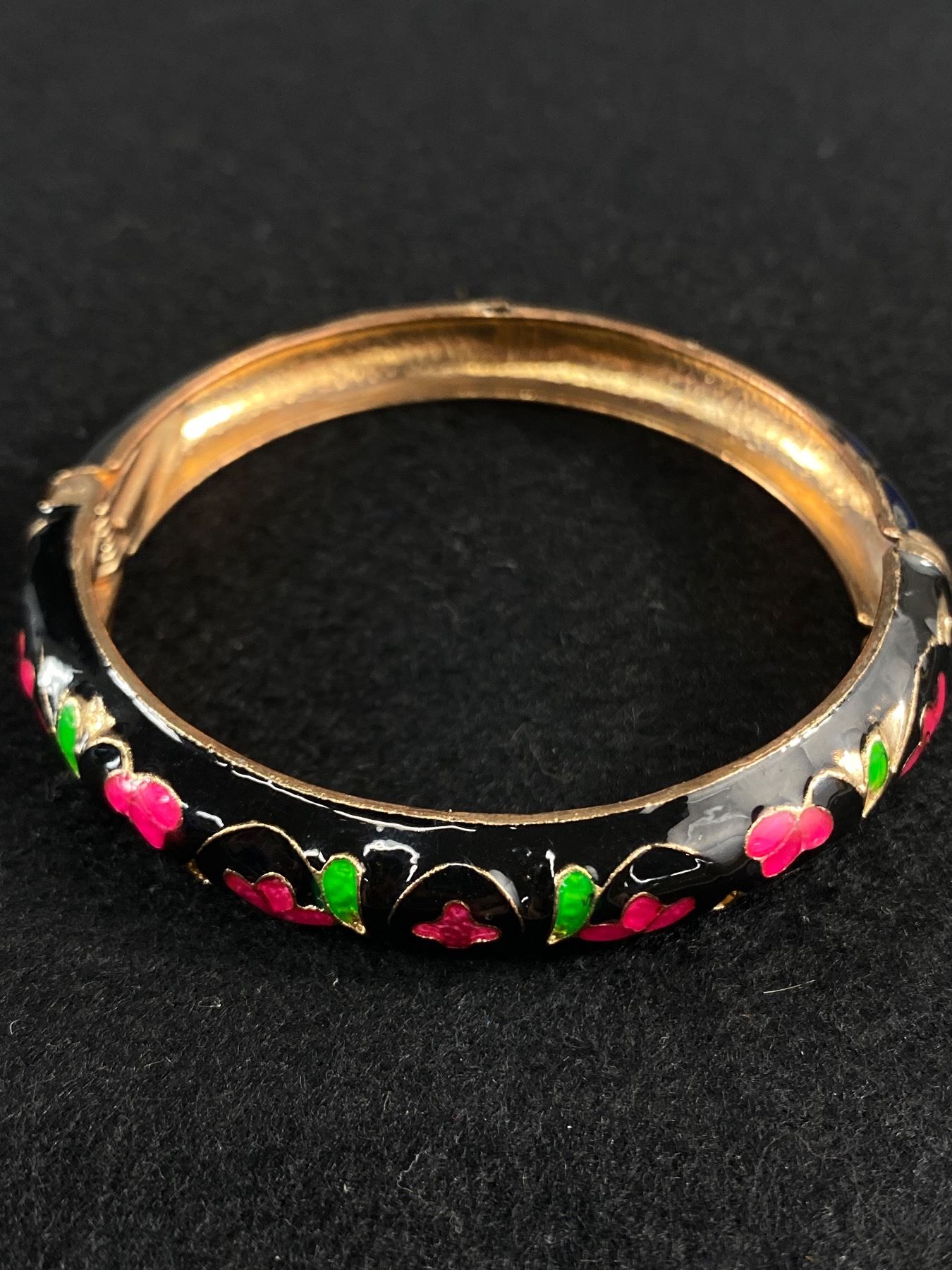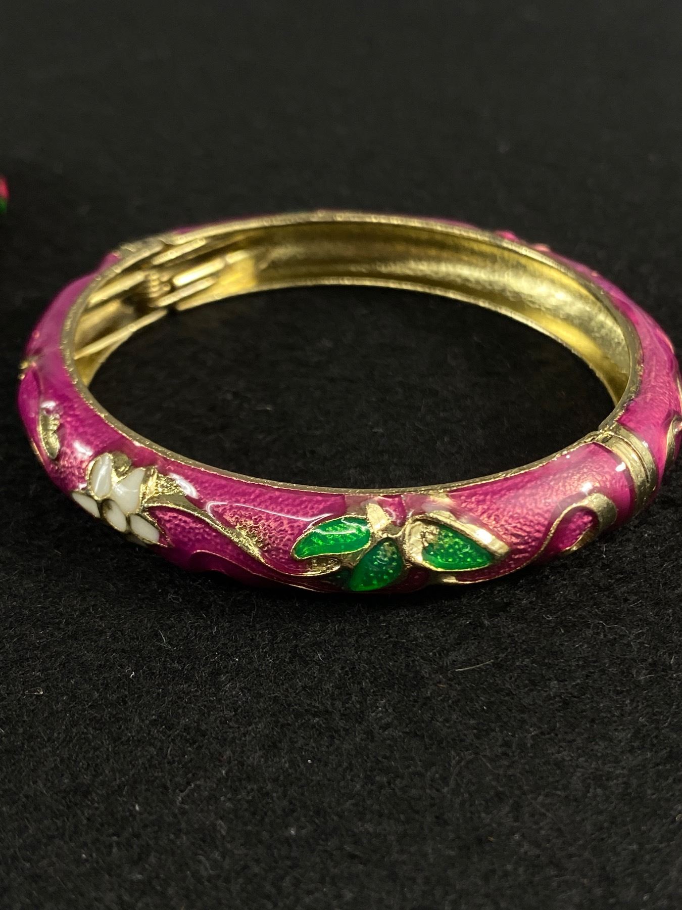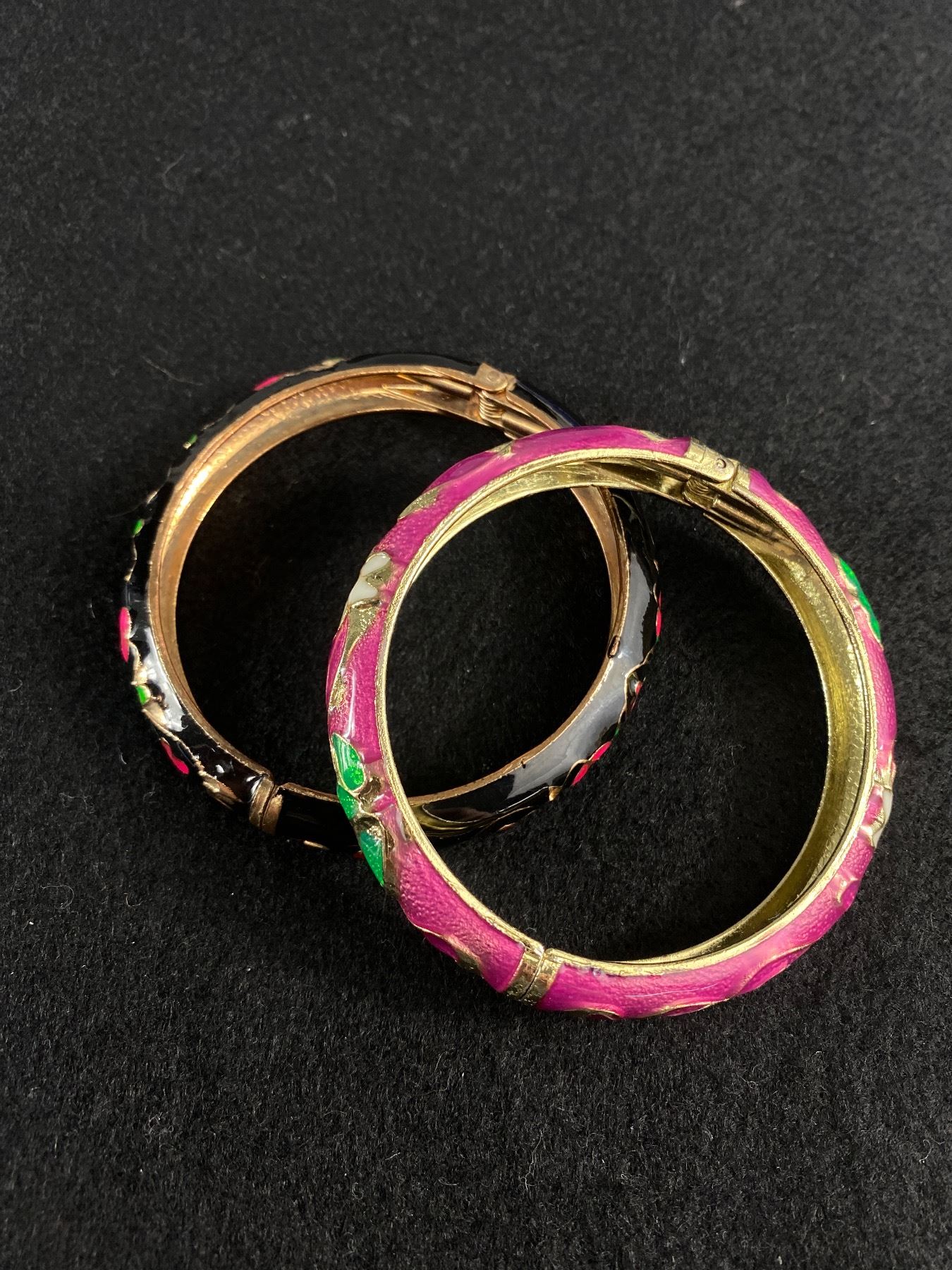 Pair of Vintage Enamel + Raised Engraved Hinged Bangles Closonne Style
