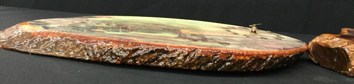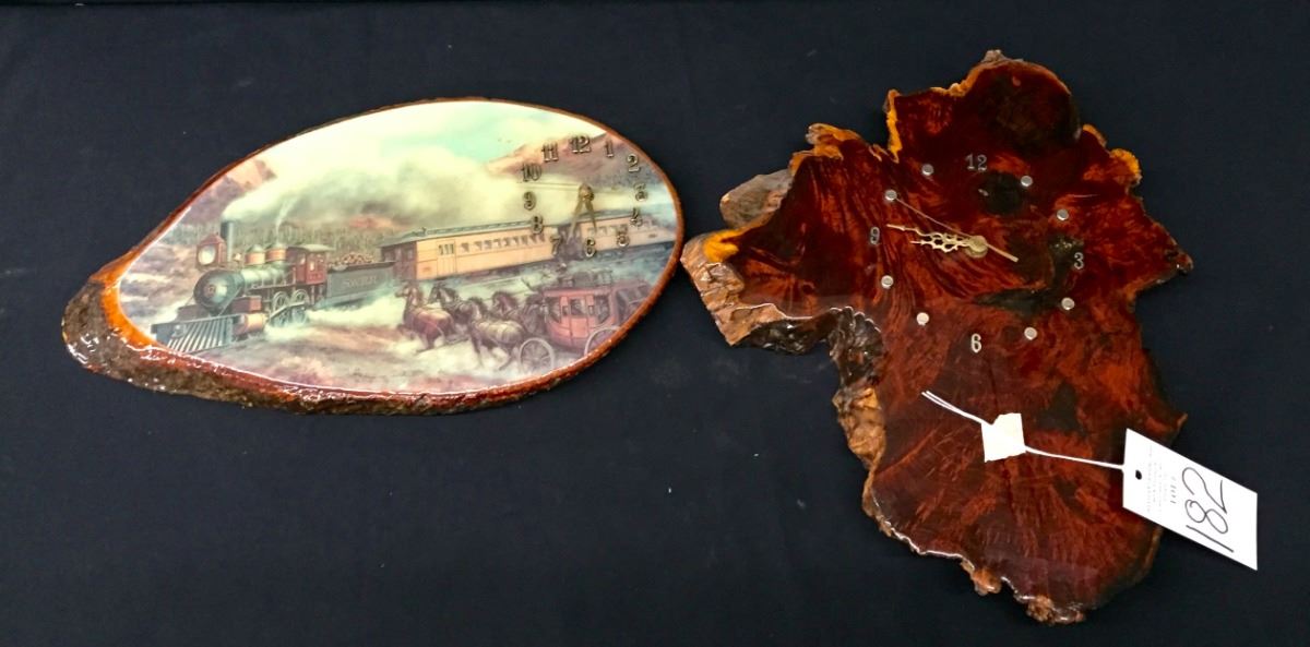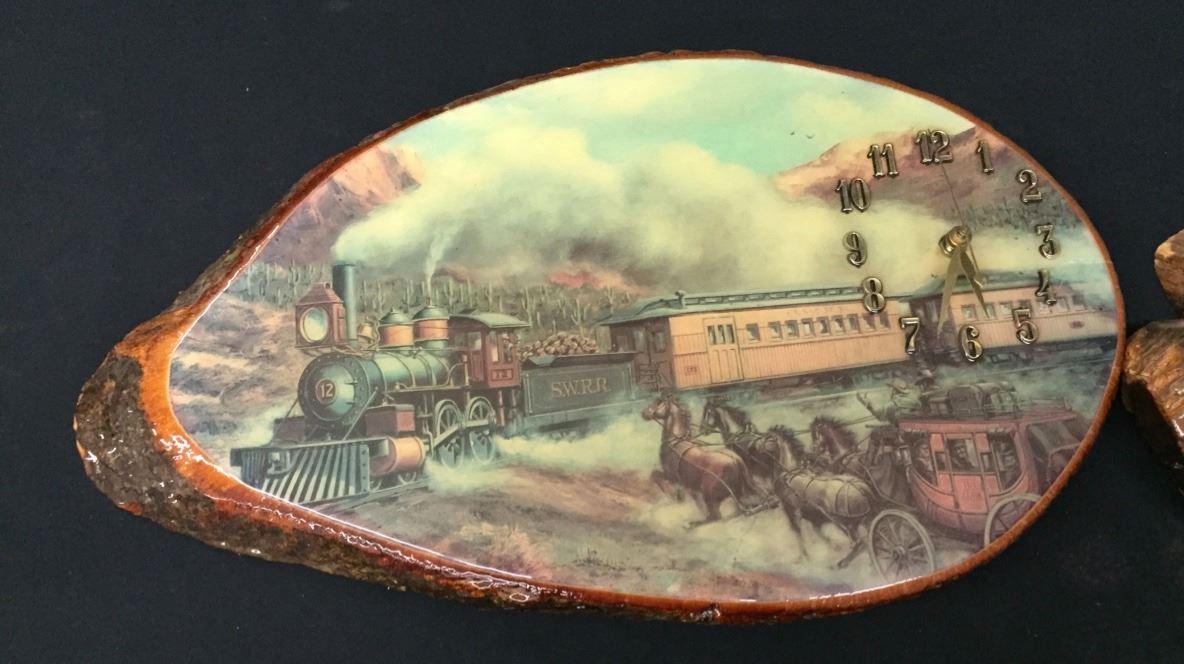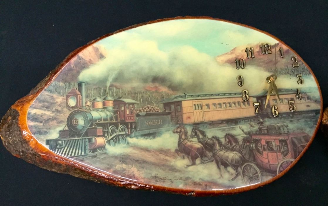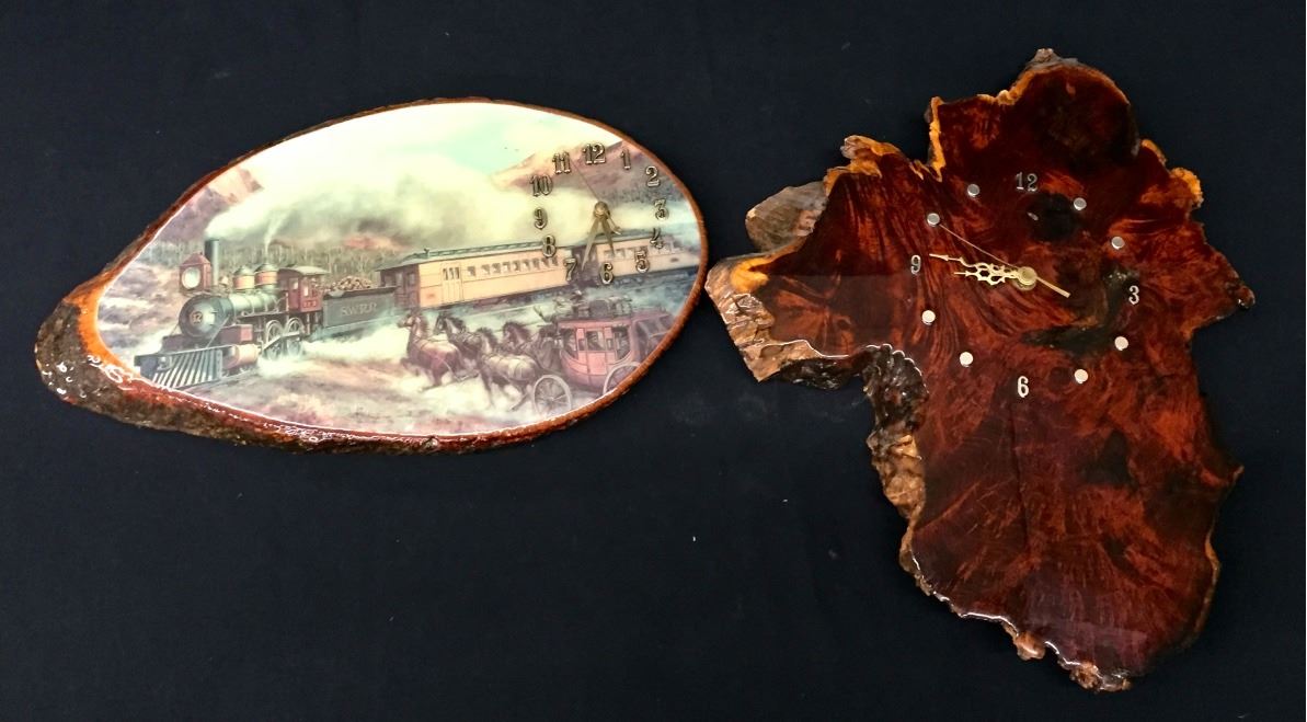 Both of these wooden Clocks seem to be in working order when batteries are put in them. The one with the railroad scene measures 17.5 inches wide by 10 inches high. The other is 14 inches wide by 17 inches high. Please look closely at pics - they are an important part of our description. Shipping: There will be a $10 handling / packaging fee for shipping this lot. The actual cost of postage will be added on top of that.
