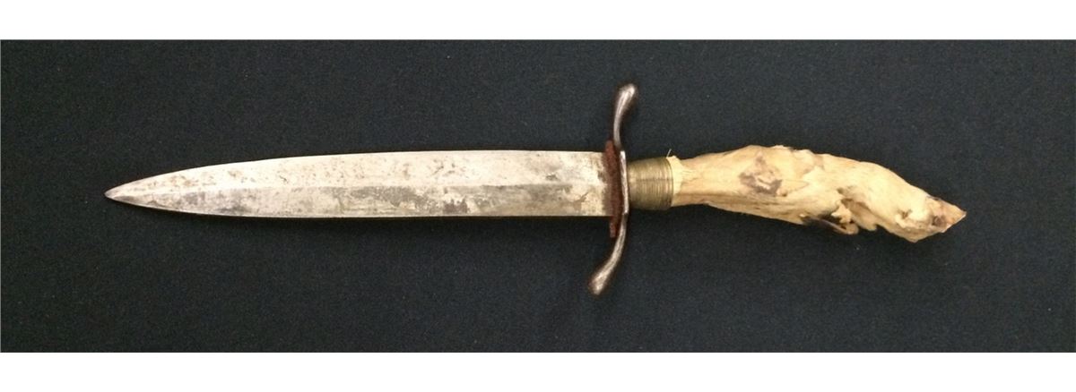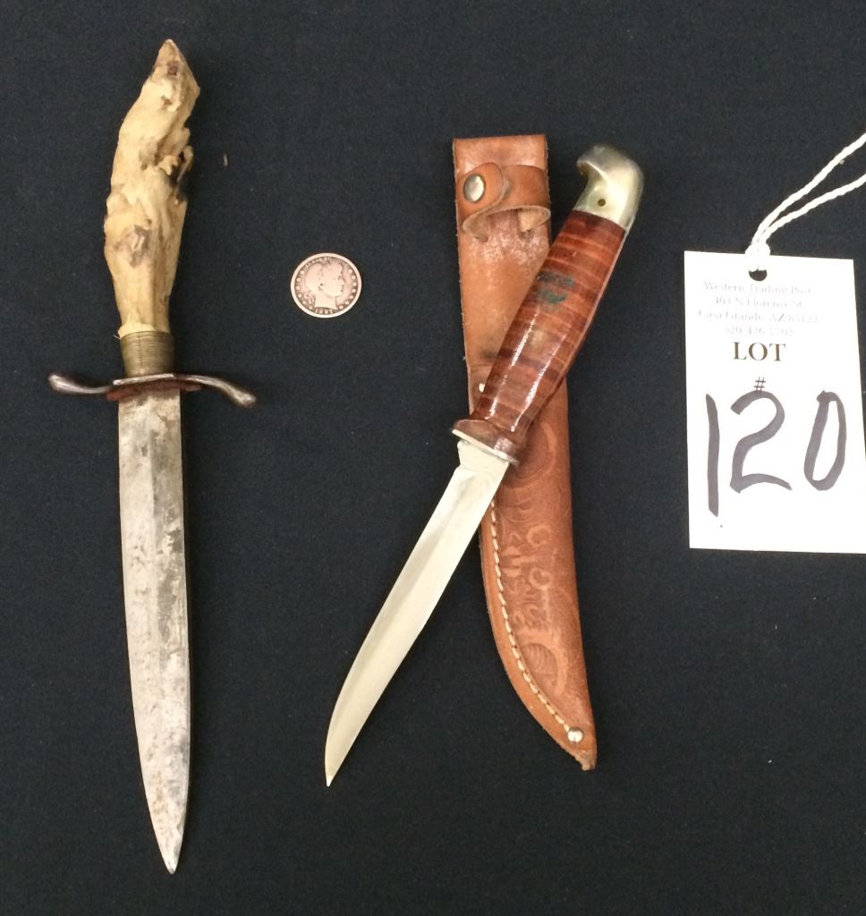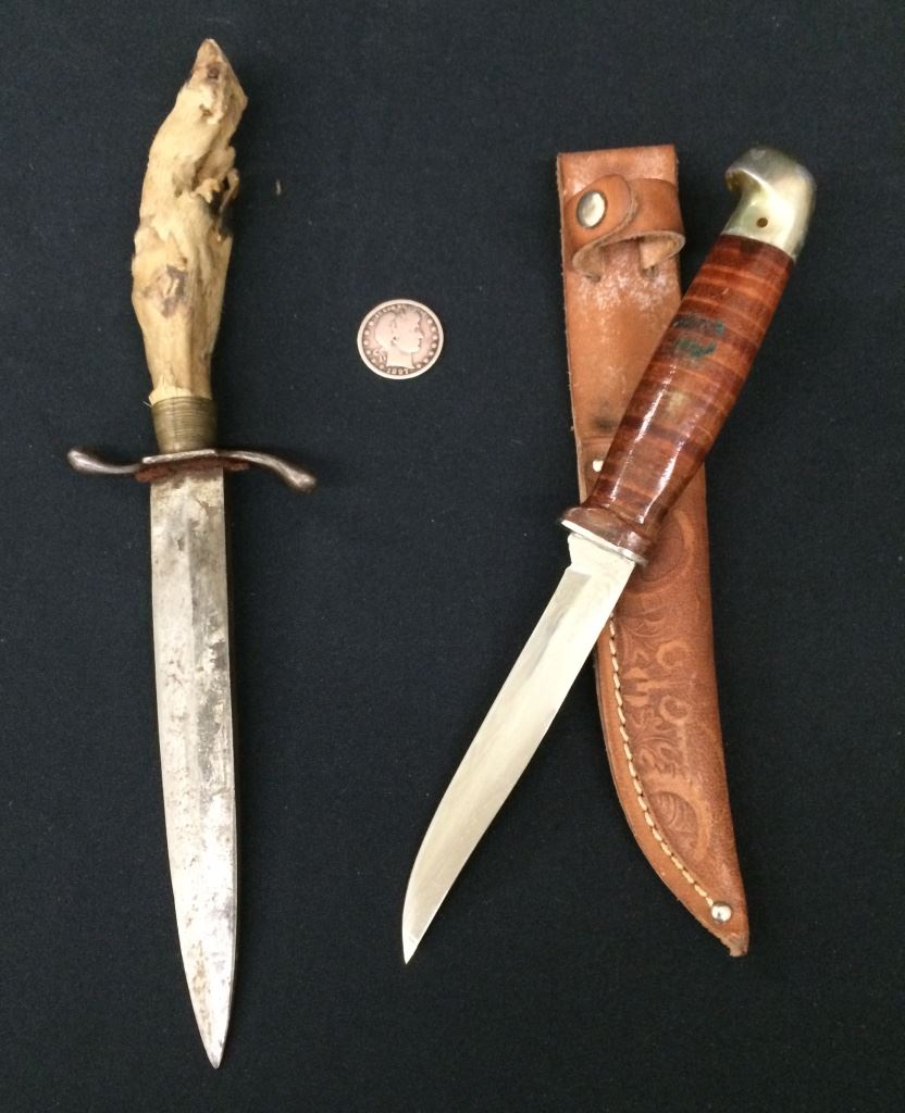 There are 2 vintage hunting knives for one money in this lot. There is a handmade knife with a deer’s foot handle measuring 11” long and a Kutmaster USA knife with a leather sheath measuring 9.5” including the sheath.
