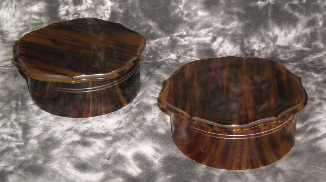 Pair of vintage lucite powder boxes. Brown tortoise color. 4.5" wide.