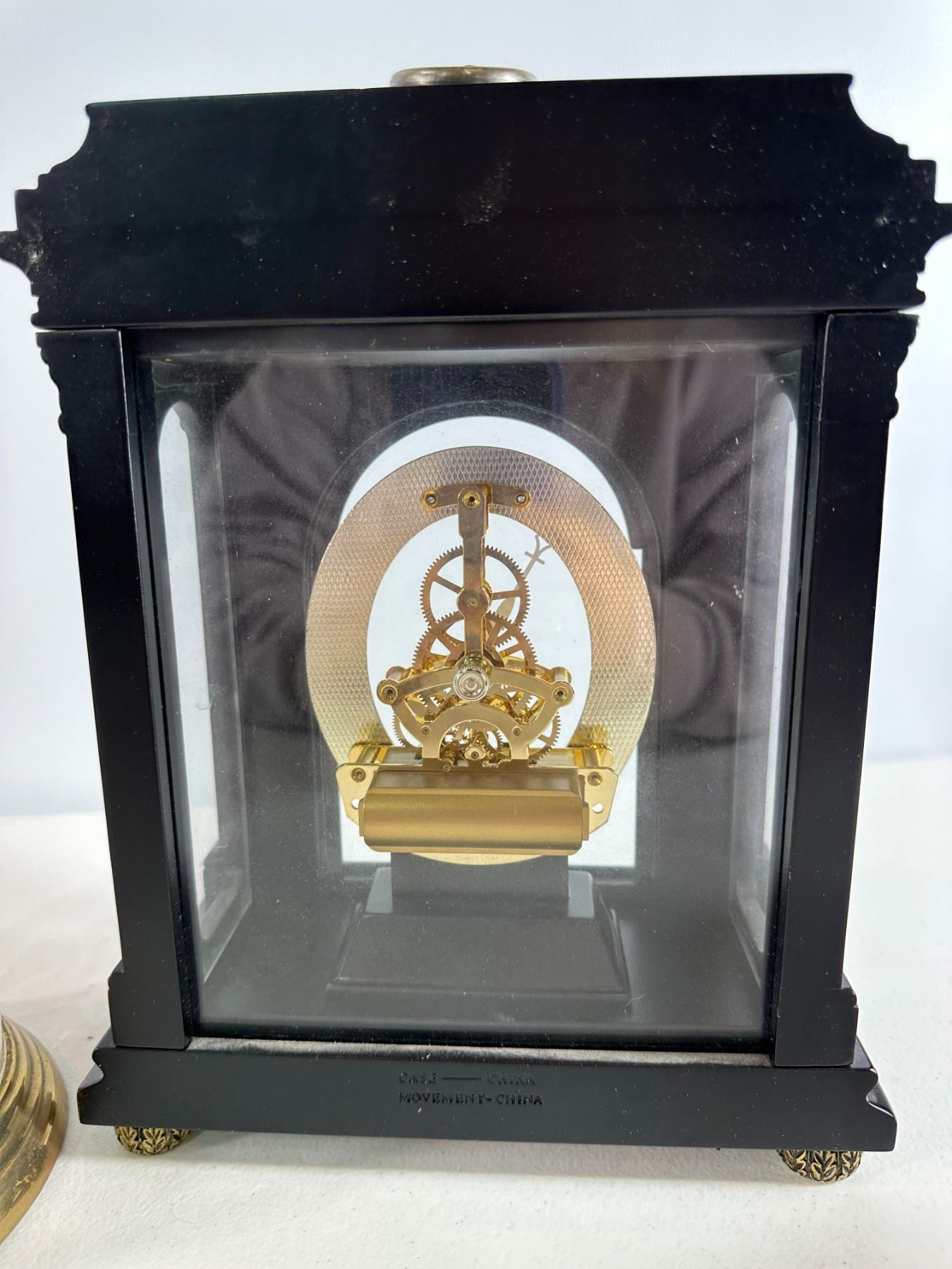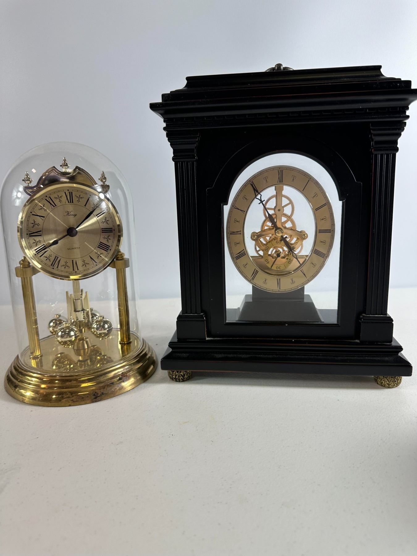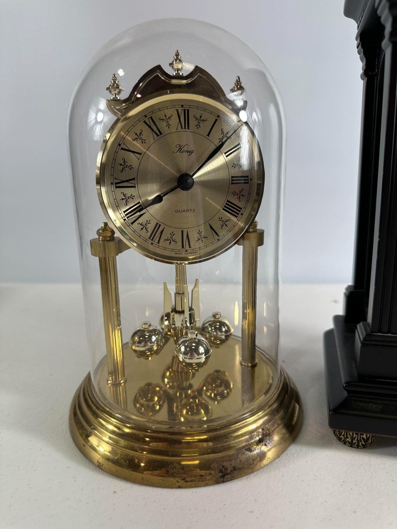 Lot of two elegant clocks: one glass-domed anniversary-style clock and one black Kienzle mantel clock with brass details. Mid-20th century Good condition, untested for function.