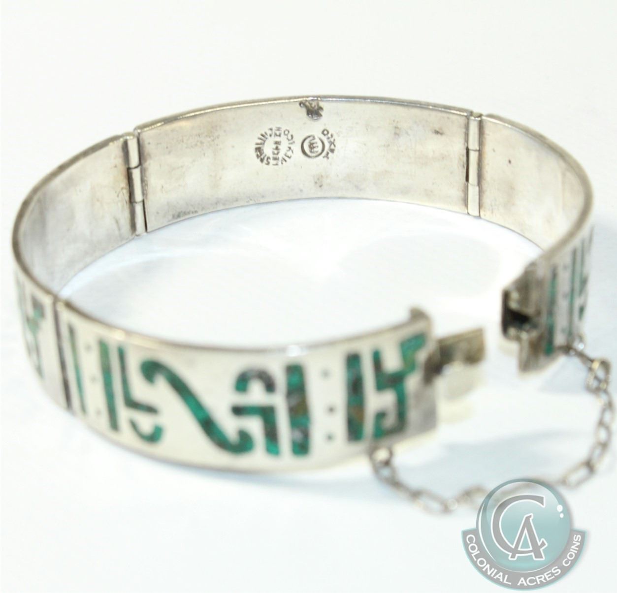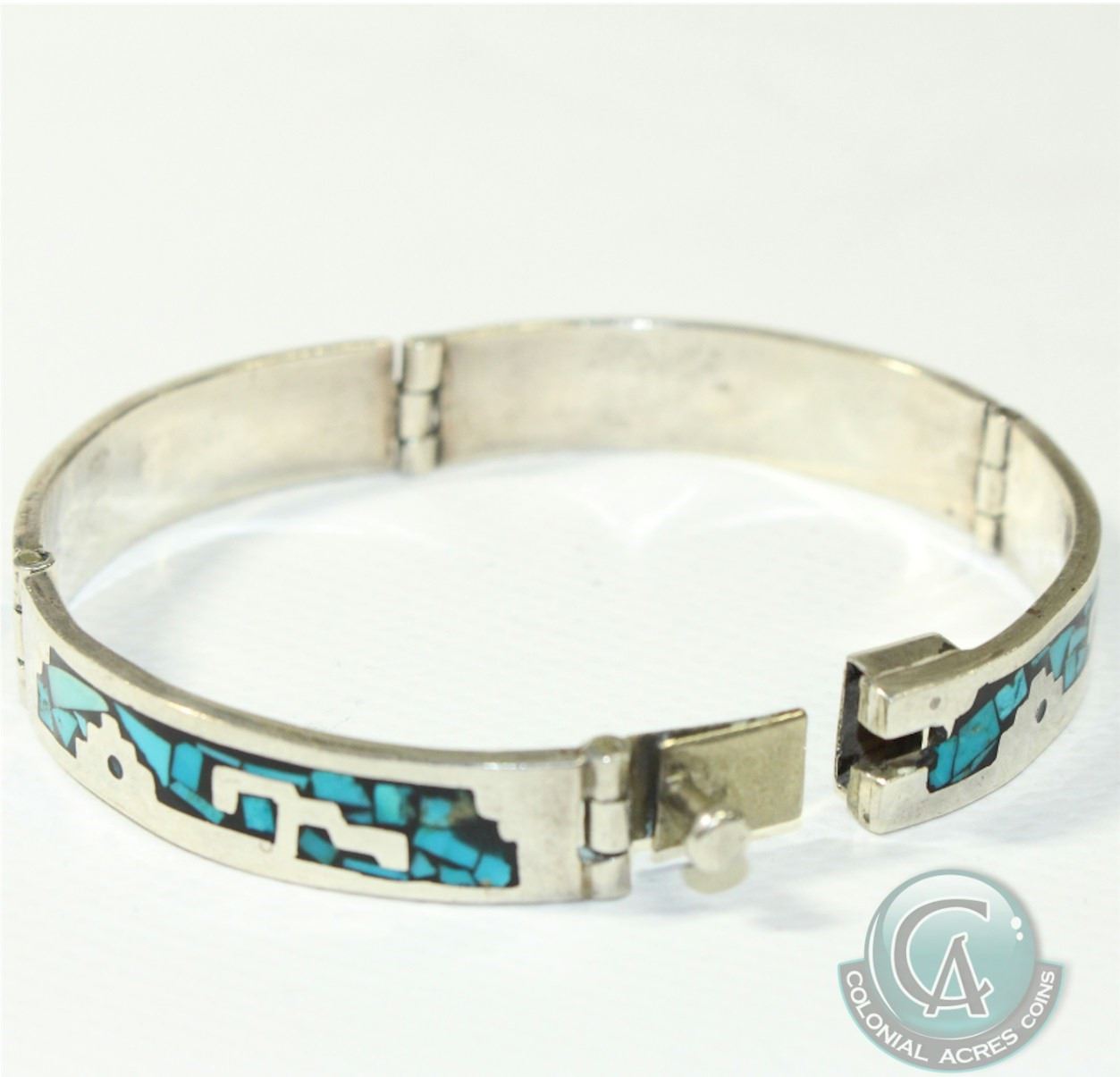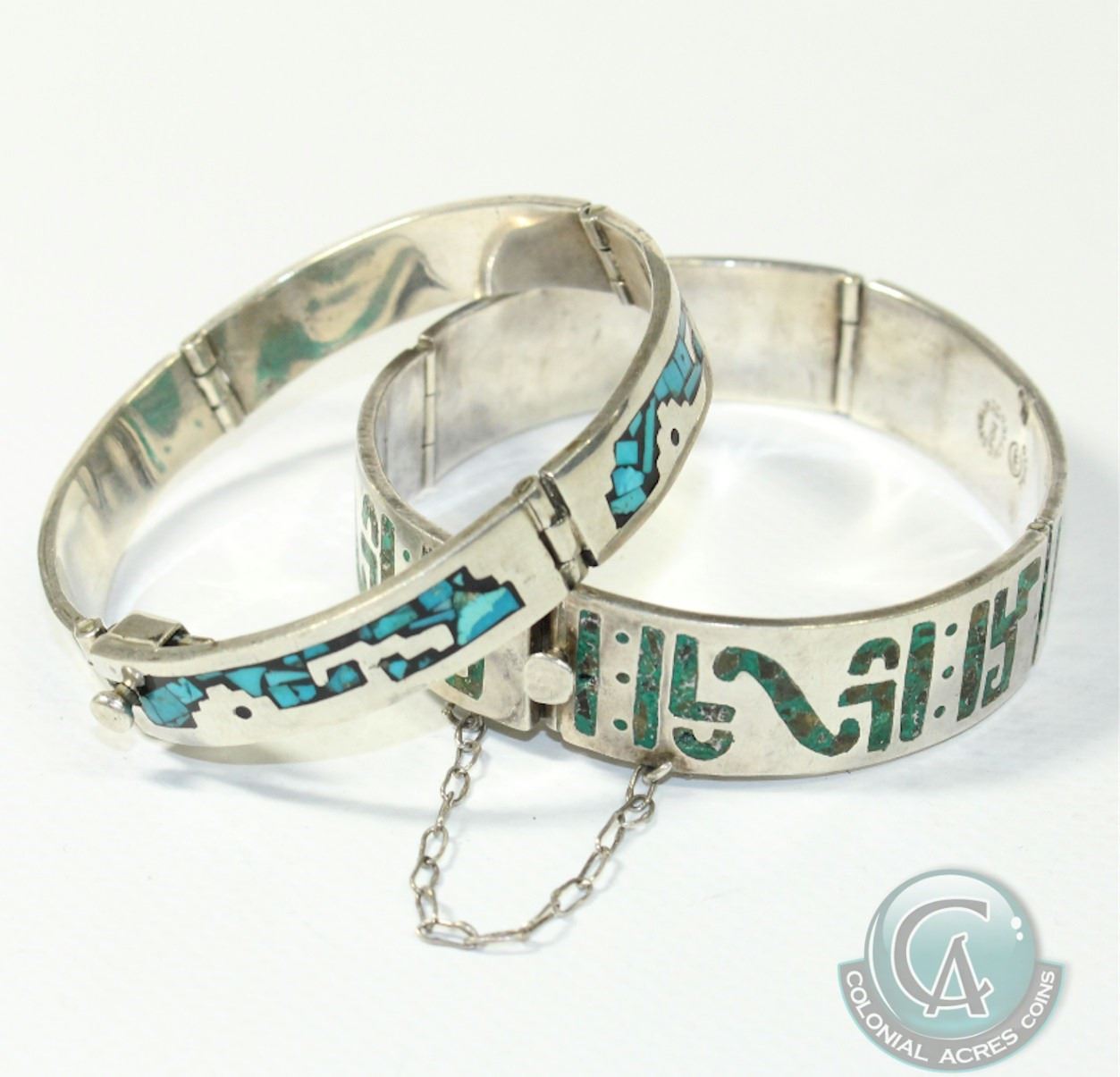 Pair of Vintage Mexico Sterling Silver Bracelets with Stone Inlays. Both Bracelets measure approximately 2 1/2" in diameter. One Features a Green Turquoise inlay signed; Miguel Melendez, while the other is inlayed with blue turquoise. Total combined weight of 90.17 grams. 2pcs.