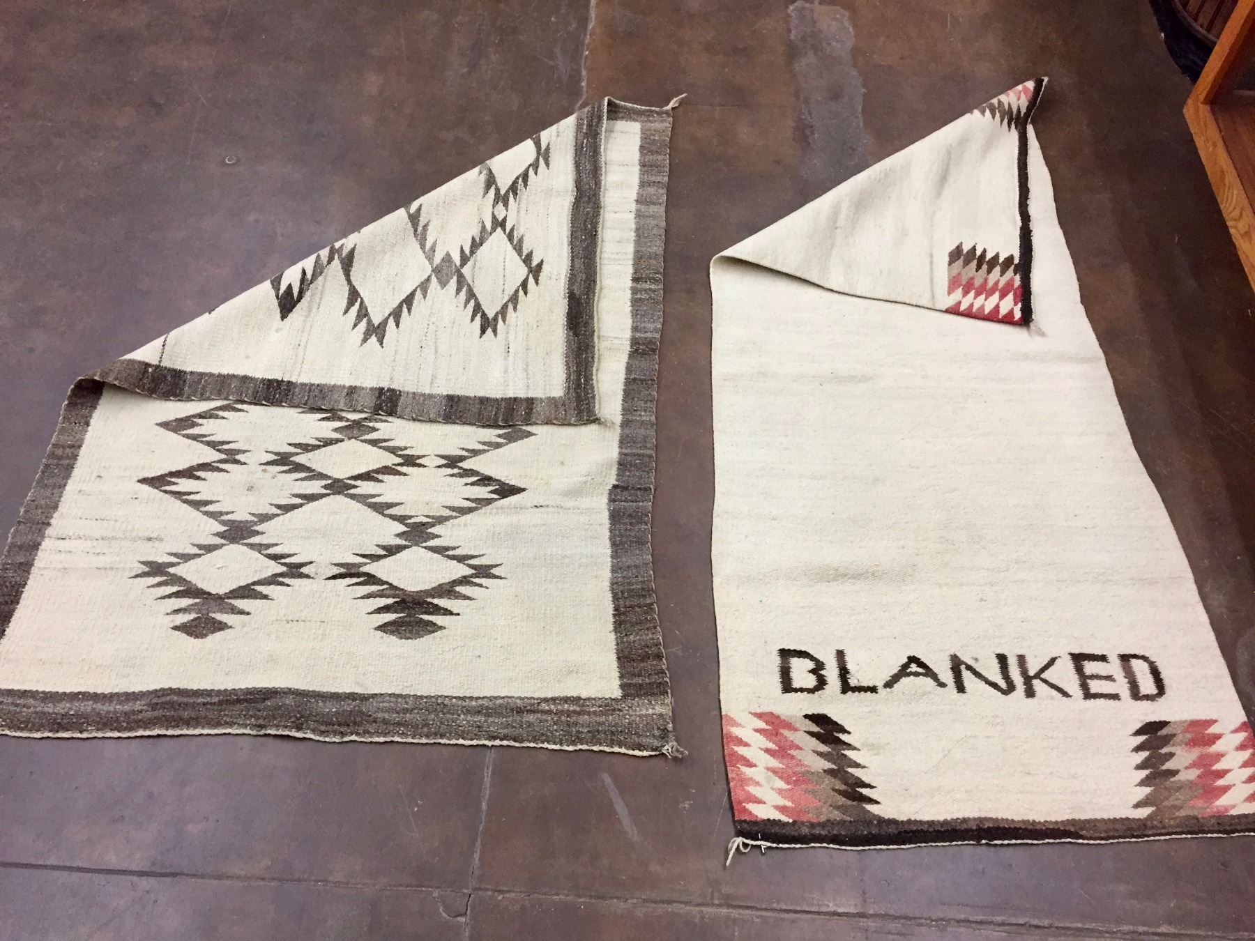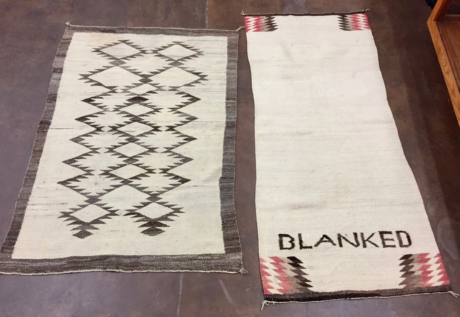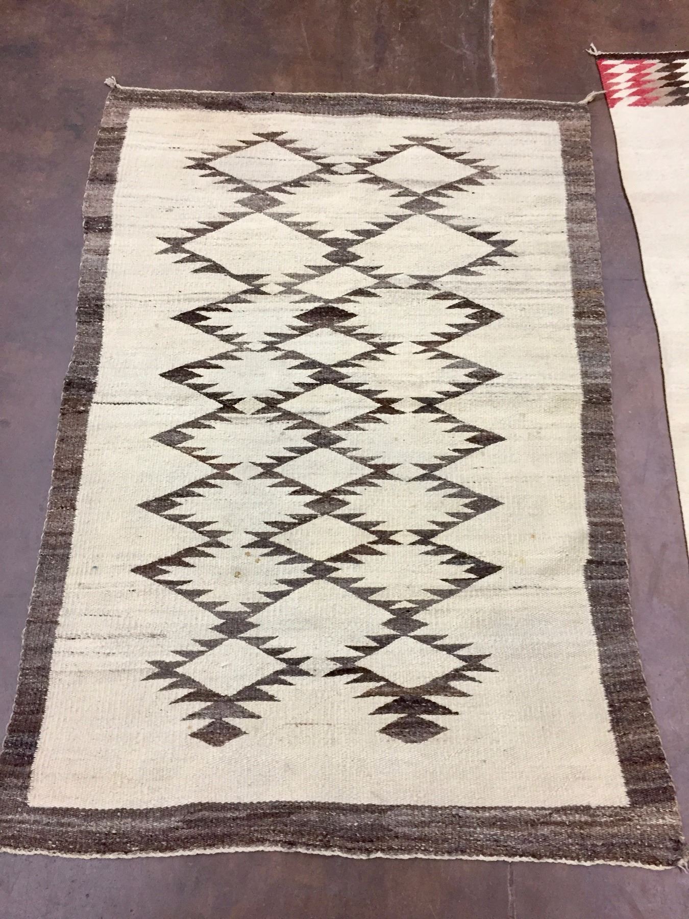 Description: Two vintage Navajo textiles. Maker: Various unknown weavers. Approx. Age: Vintage. Size: Approx. 70” l x 30” w and approx. 60 x 41” l x 1/2“ w. Condition: Fair too poor for their age, normal wear expected. Please look closely at the pictures - they are an important part of our description. Shipping: There will be a $7 handling / packaging fee for shipping this lot. The actual cost of postage will be added on top of that.